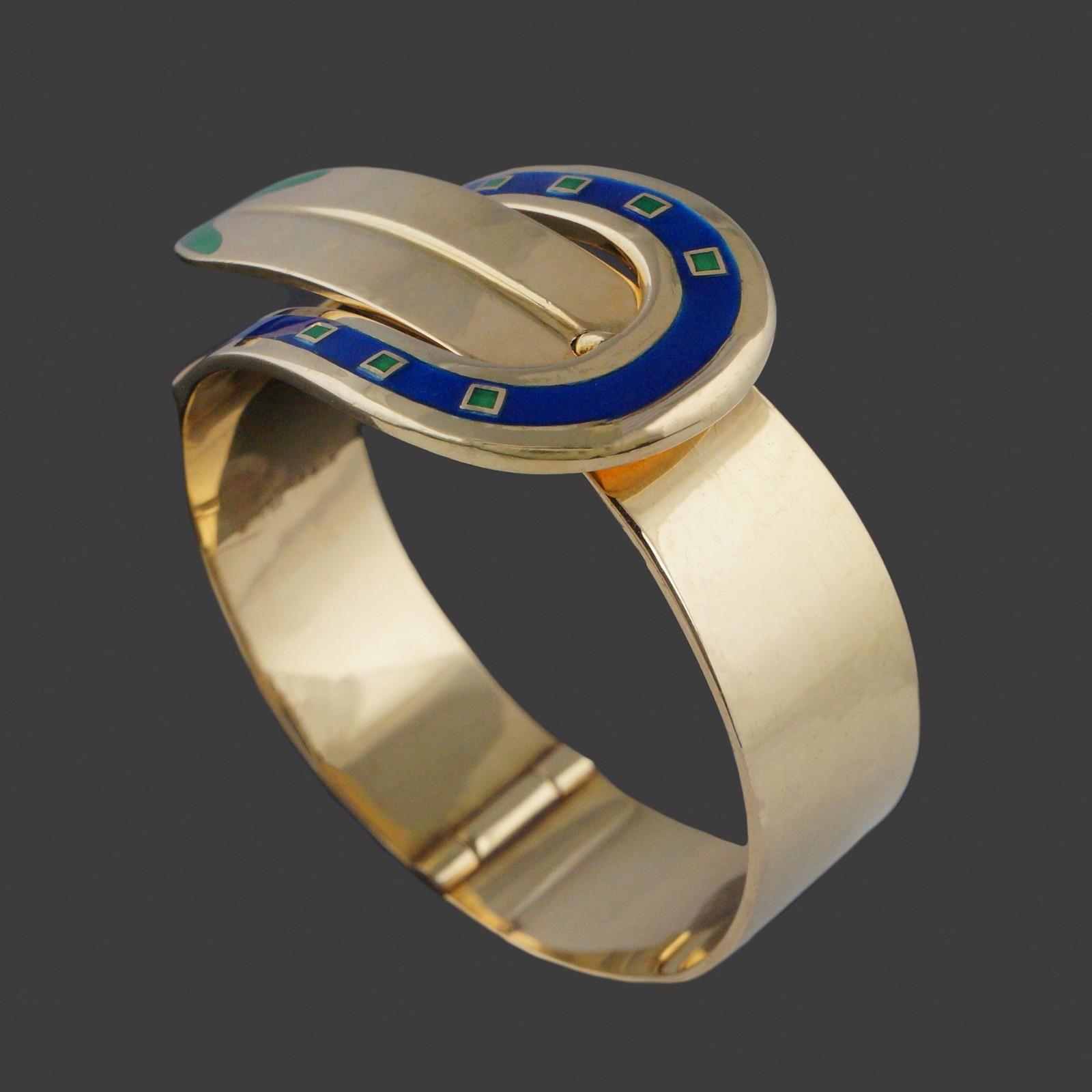 Amazing and rare vintage Gucci solid 18K yellow gold, blue and green enamel hinged buckle bangle bracelet in excellent original condition. Exceptionally well preserved in one family's ownership from new. Appearing to be hardly, if ever, worn. Smooth heavy gauge solid 18K gold construction. Perfect enamel. High quality, exceptionally well made piece by world renowned Gucci.  Few signs of use, excellent overall.  Please see our high resolution photos, with magnifying option, for your review.