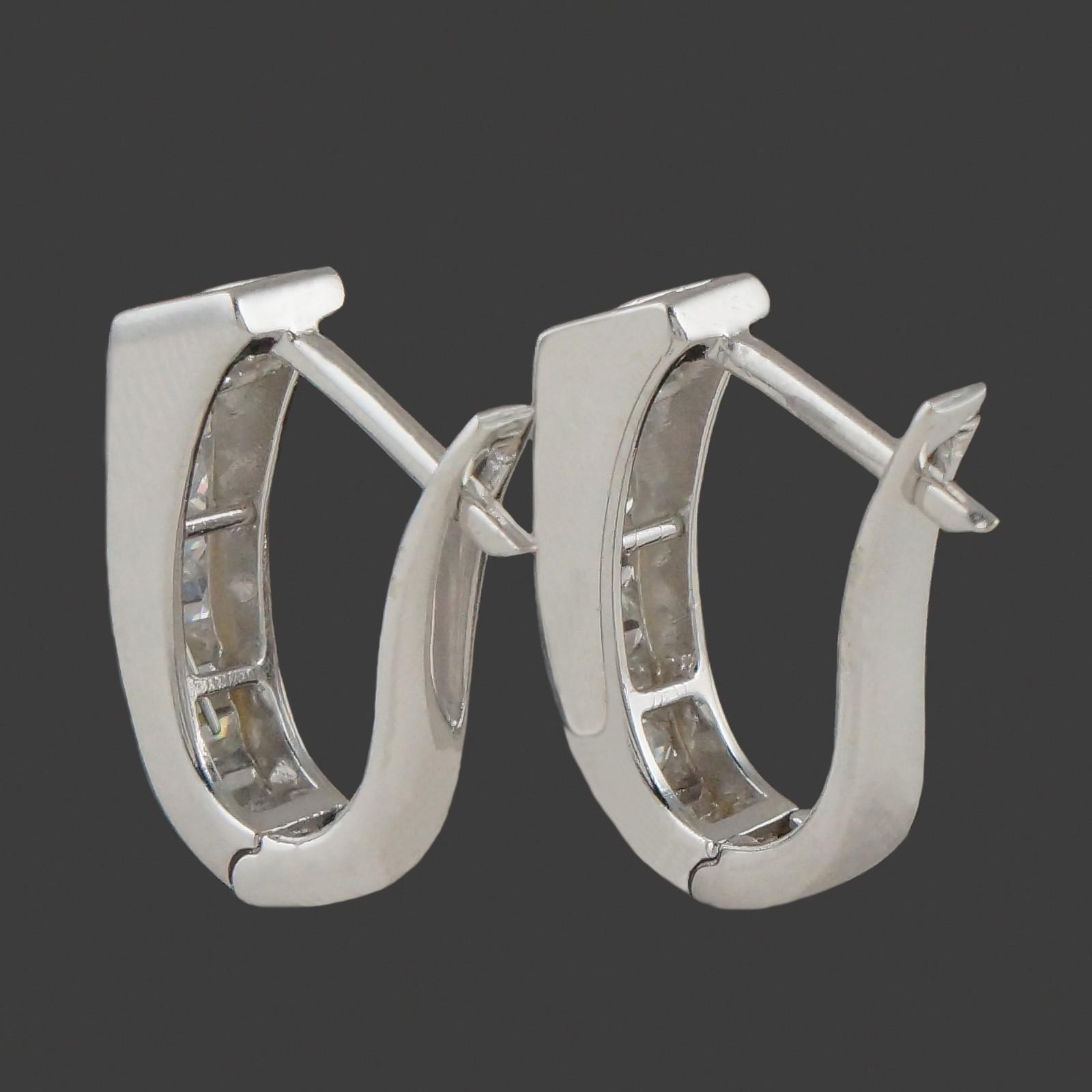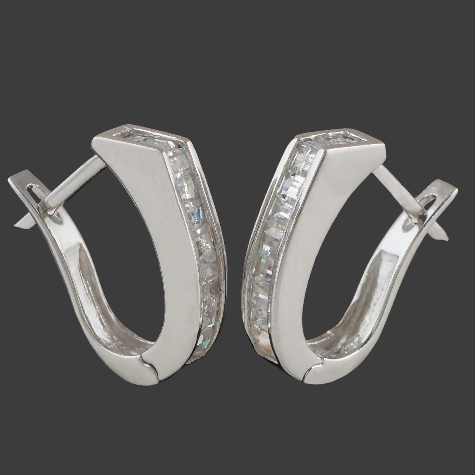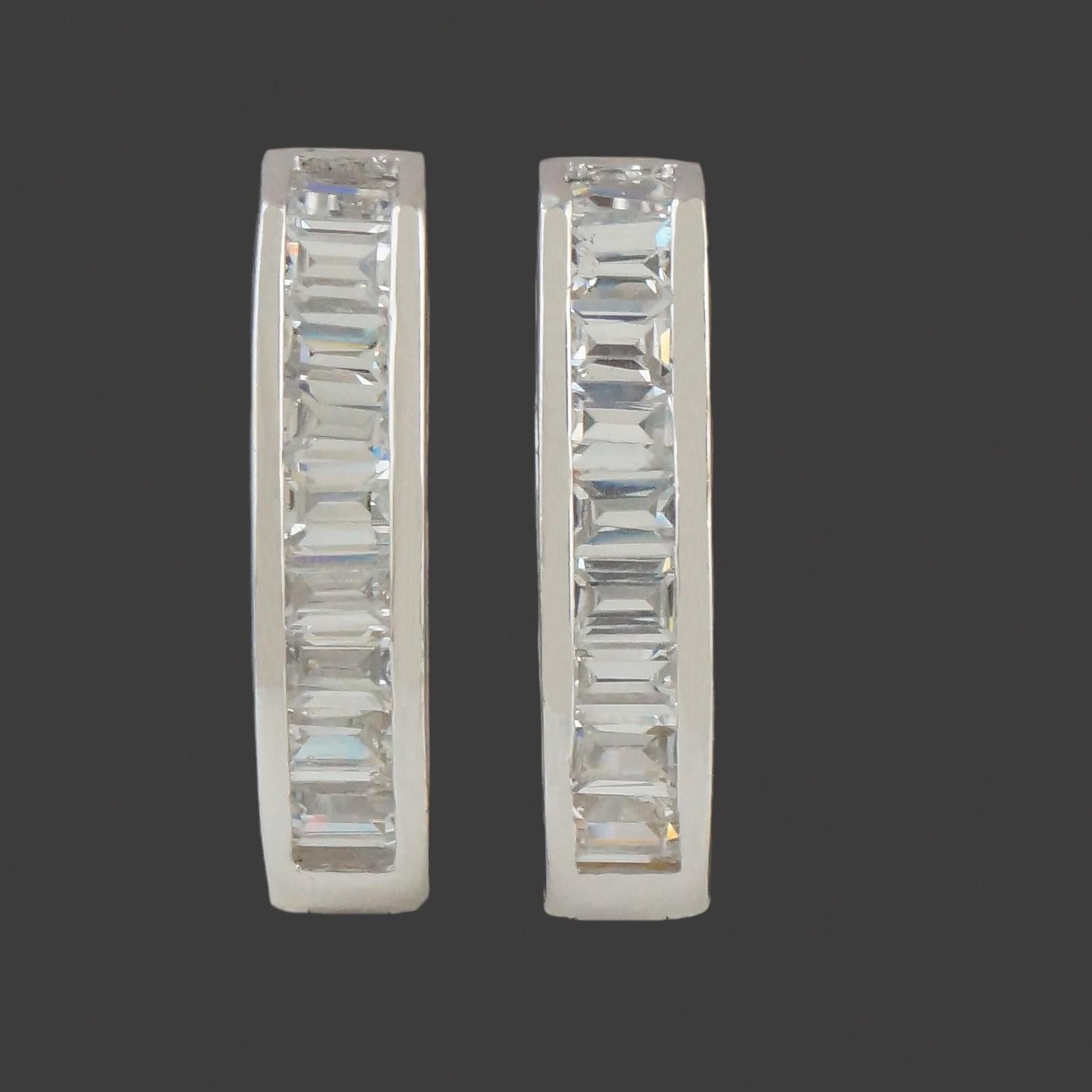 Modernist solid 18K white gold and baguette diamond 3/4" hinged huggie hoop estate earrings in excellent original condition. High quality, well made estate pair. Please see our high resolution photos, with magnifying option, for your review.