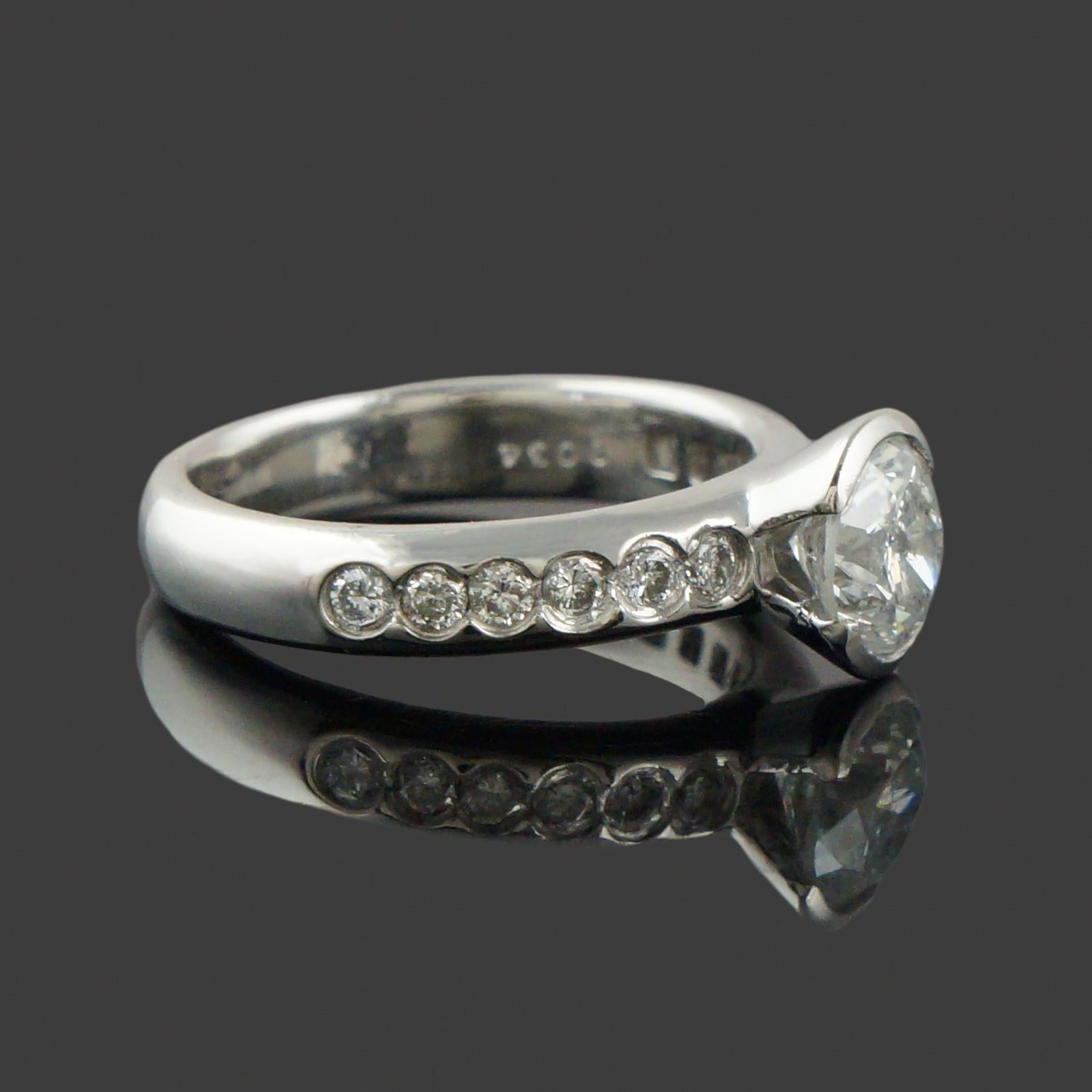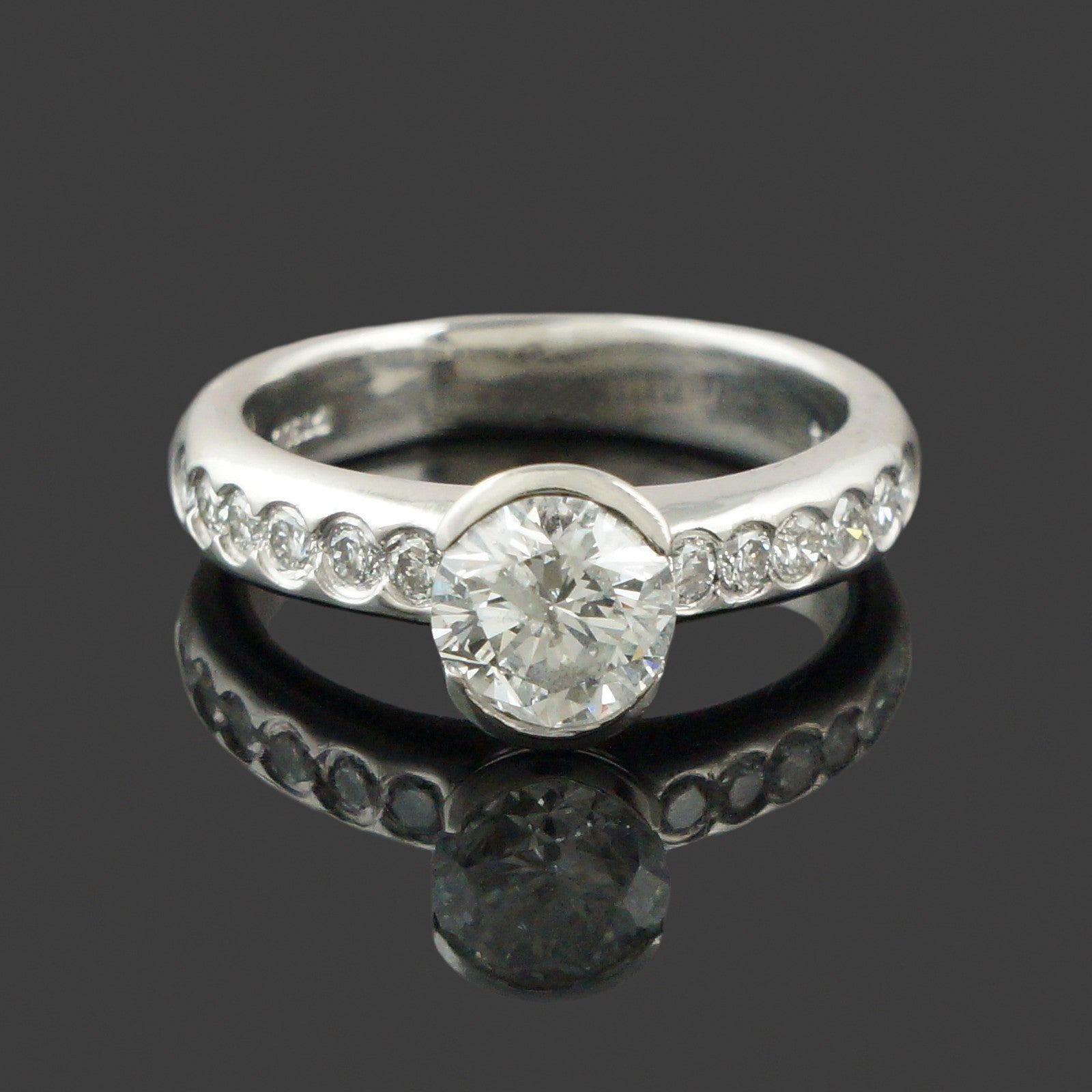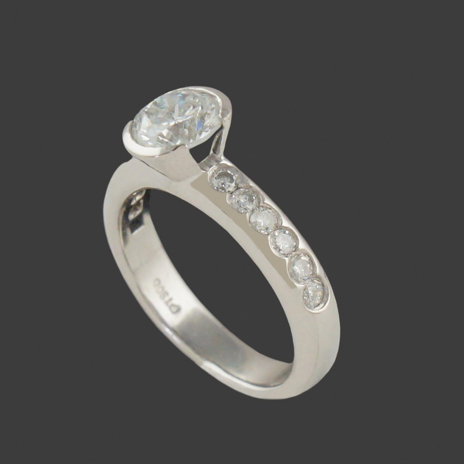 Platinum and demi bezel diamond half eternity engagement ring, wedding band, or anniversary ring in excellent original condition. High quality, beautifully crafted estate piece. Few signs of use, excellent overall. Please see our high resolution photos of this estate piece, with magnifying option, for your review.