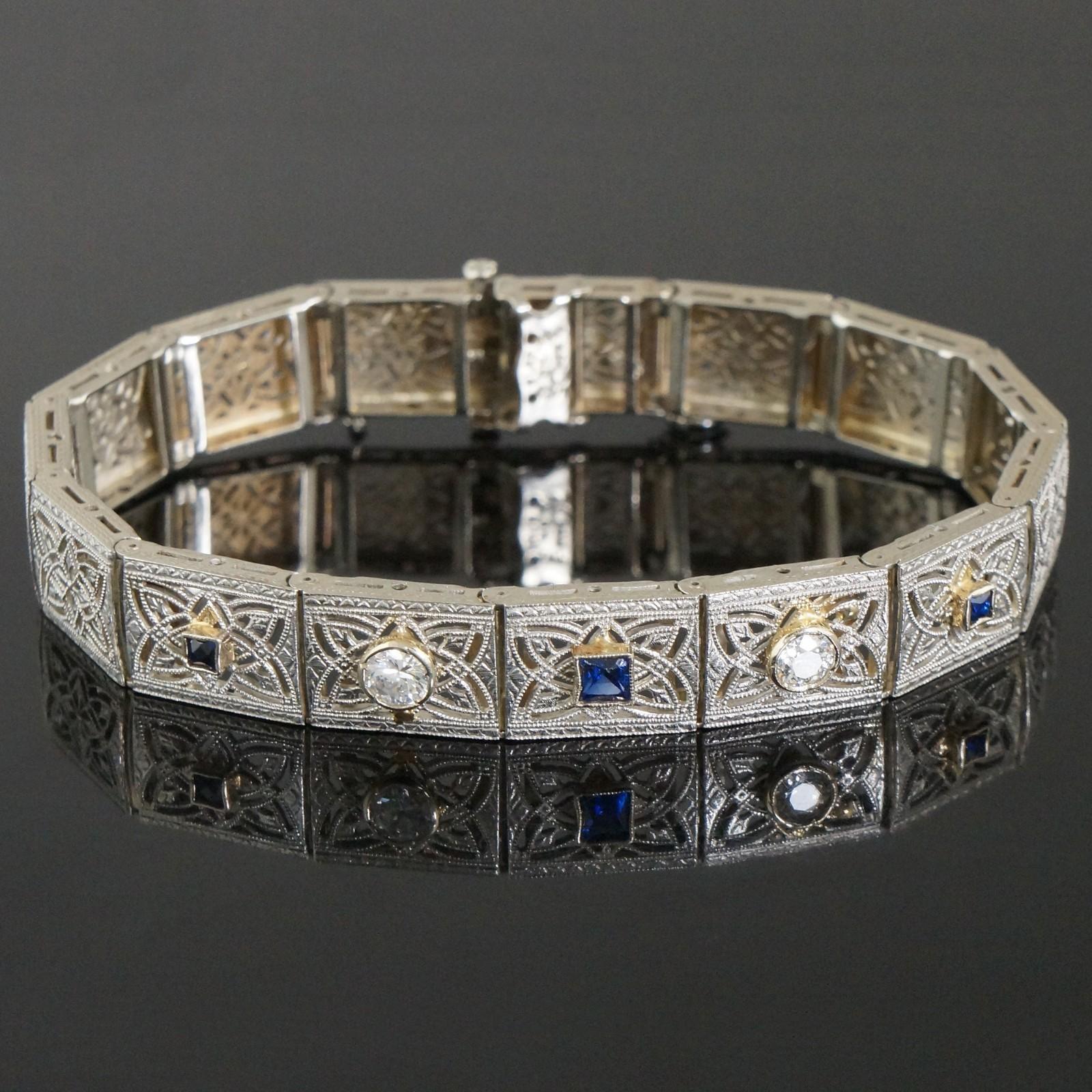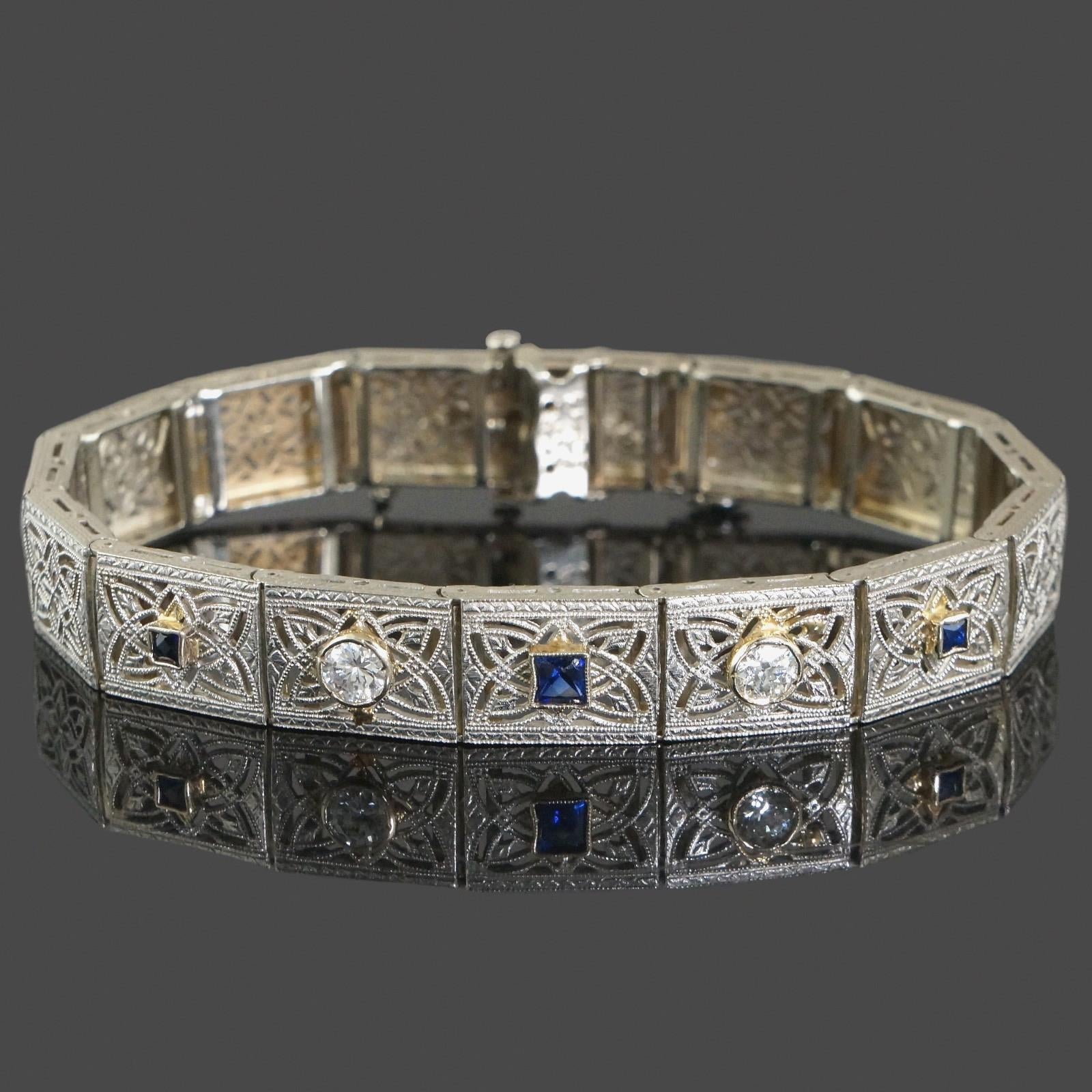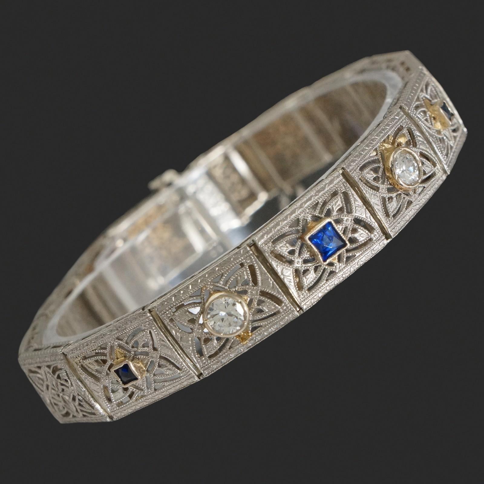 1920s Art Deco Platinum Top, 14K Gold, OMC Diamond & Sapphire Filigree Bracelet