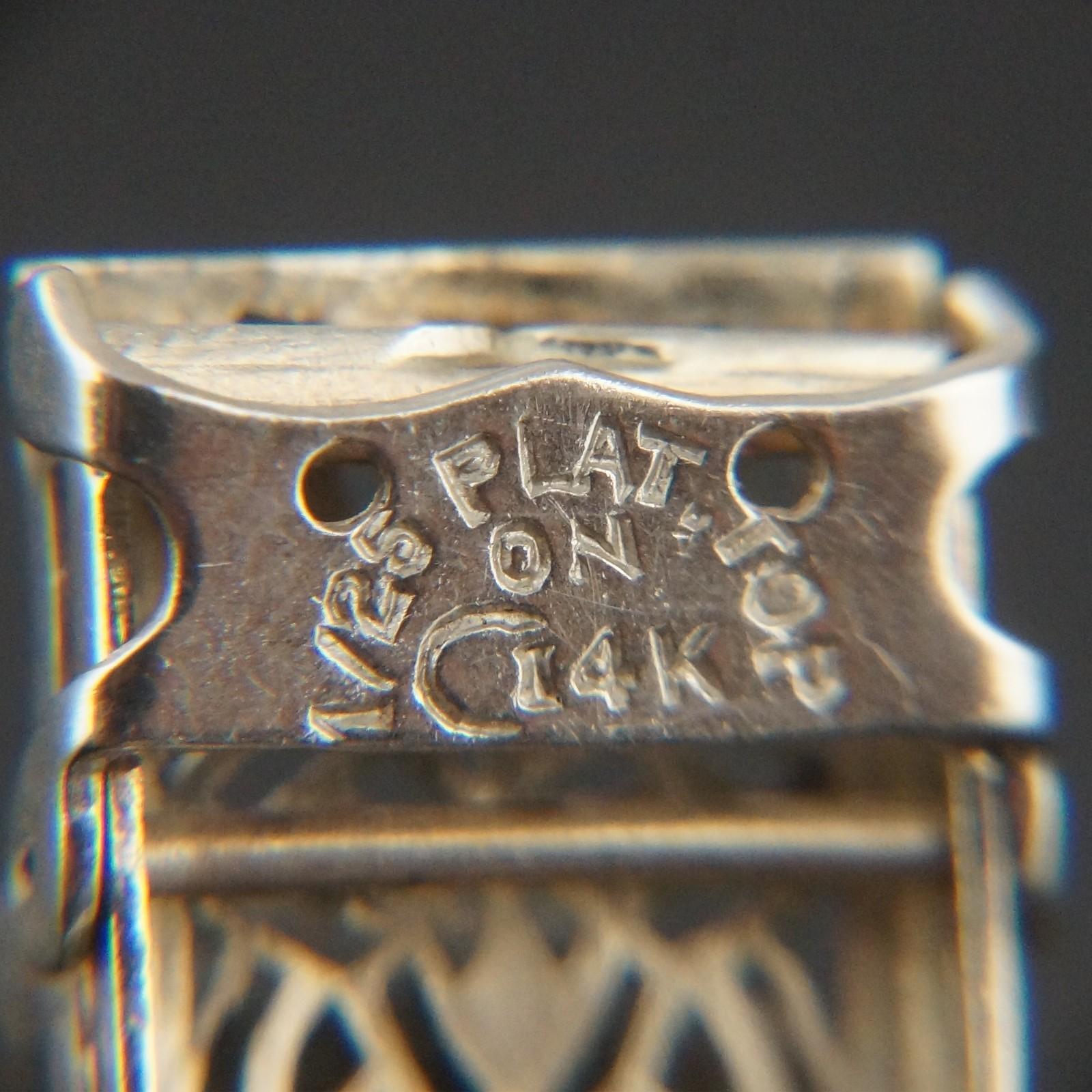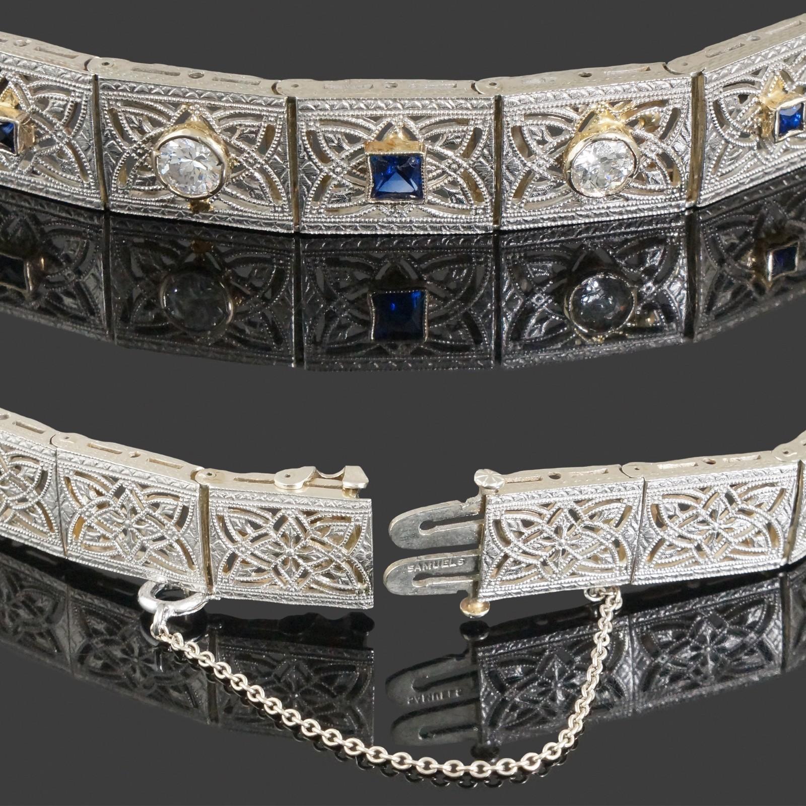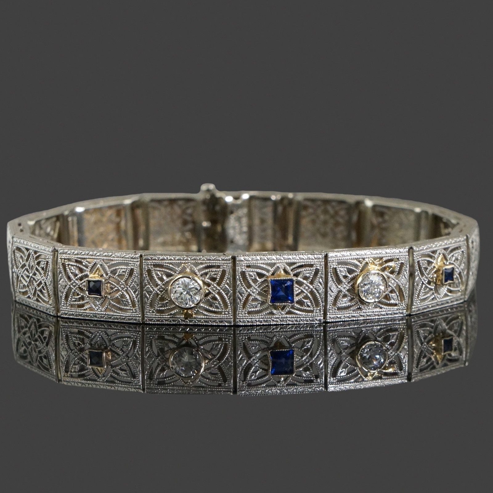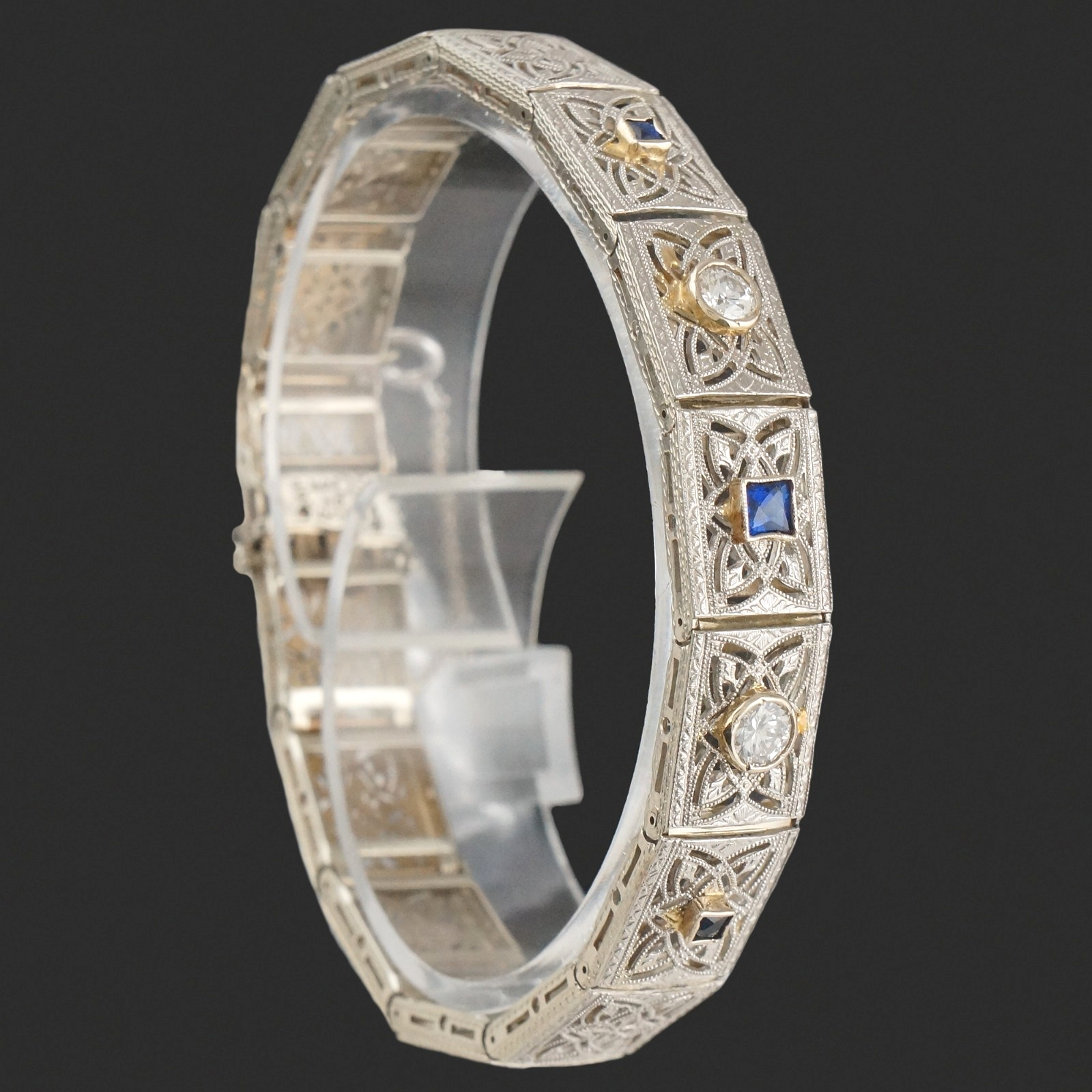 1920s Art Deco Platinum Top, 14K Gold, OMC Diamond & Sapphire Filigree Bracelet