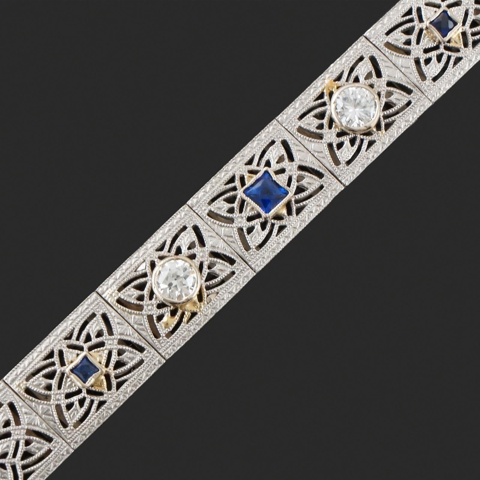 Absolutely stunning antique 1920s Art Deco solid 14K gold Platinum top, Old-Mine-Cut diamond and synthetic sapphire filigree bracelet in excellent original condition. Please see our resolution photos, with magnifying option, for your review.
