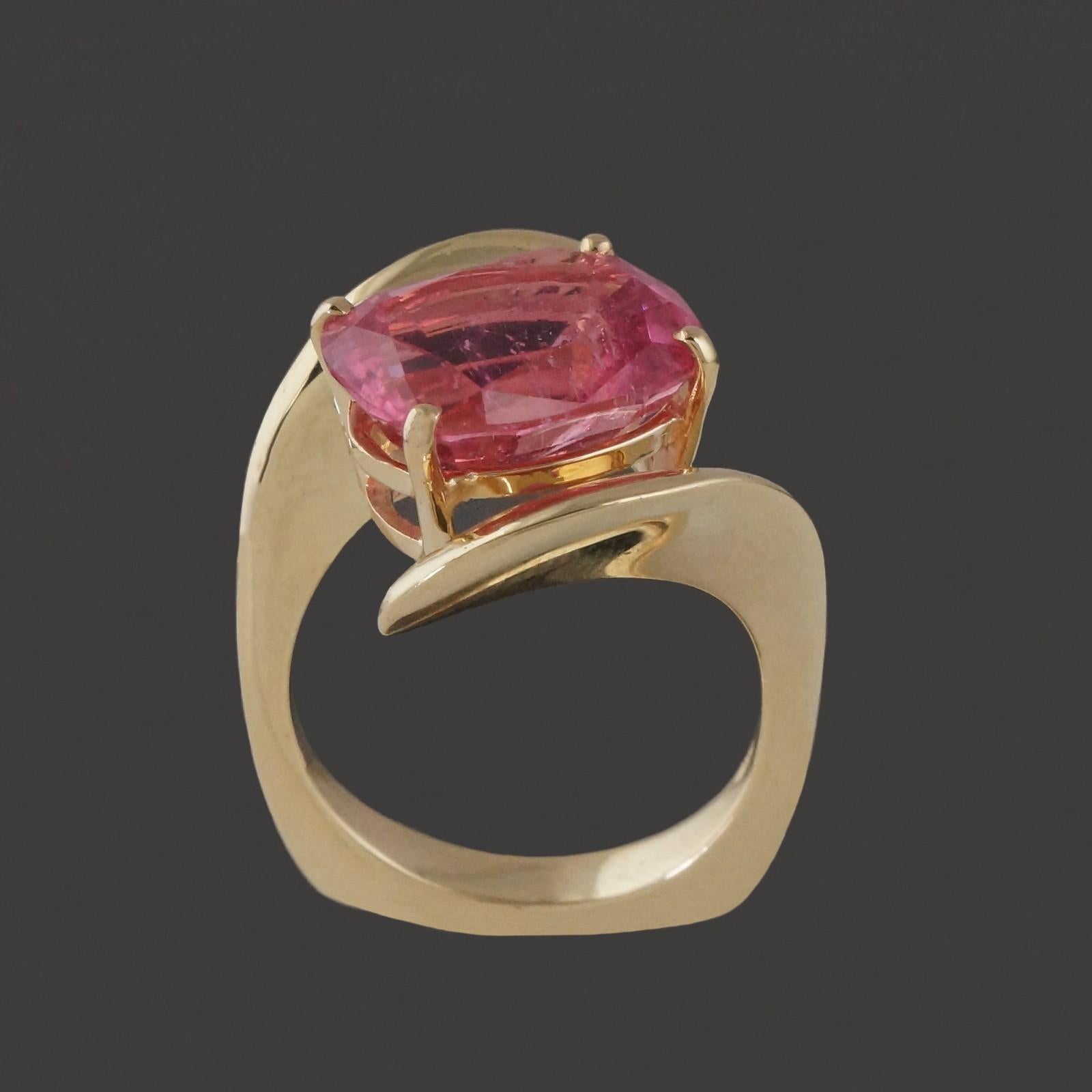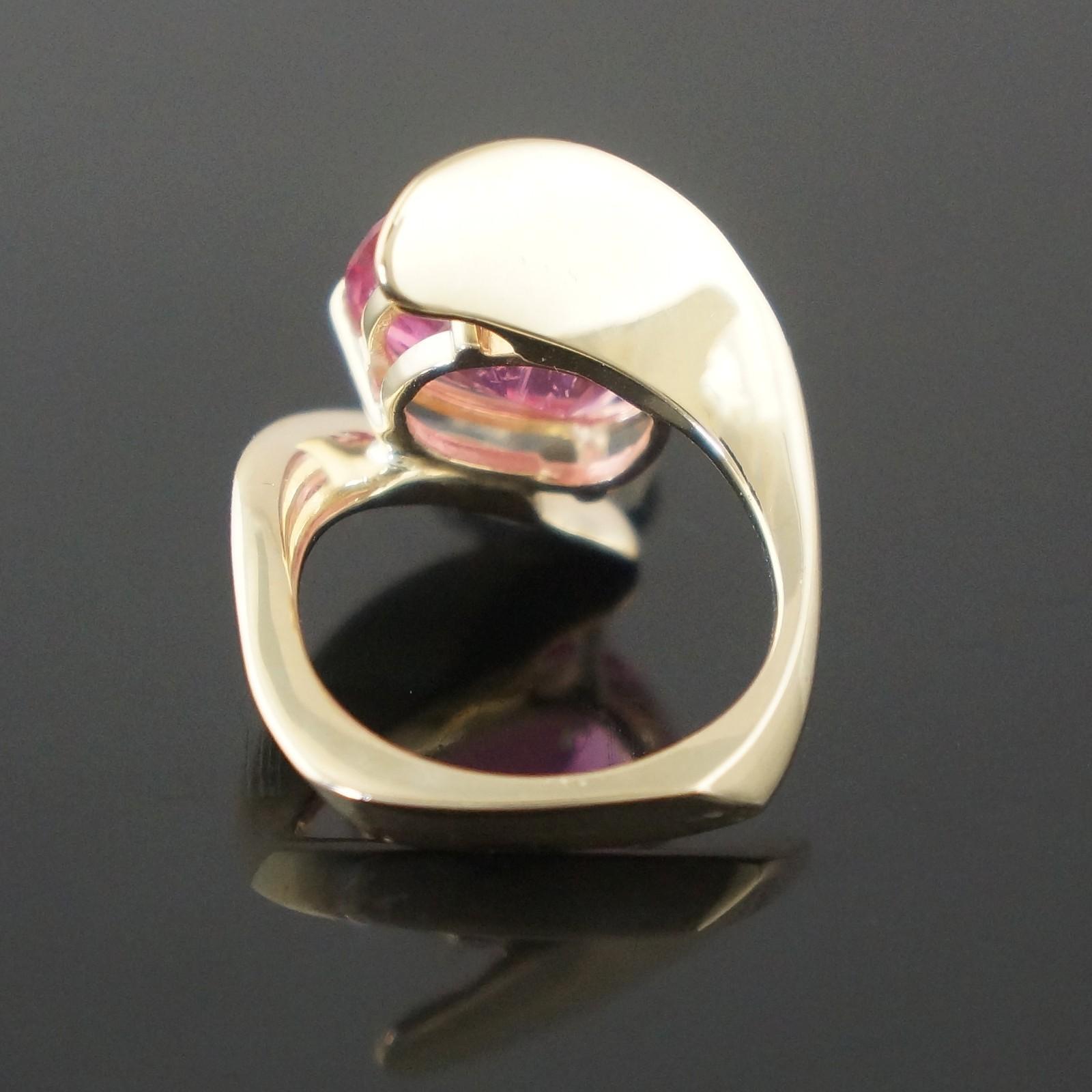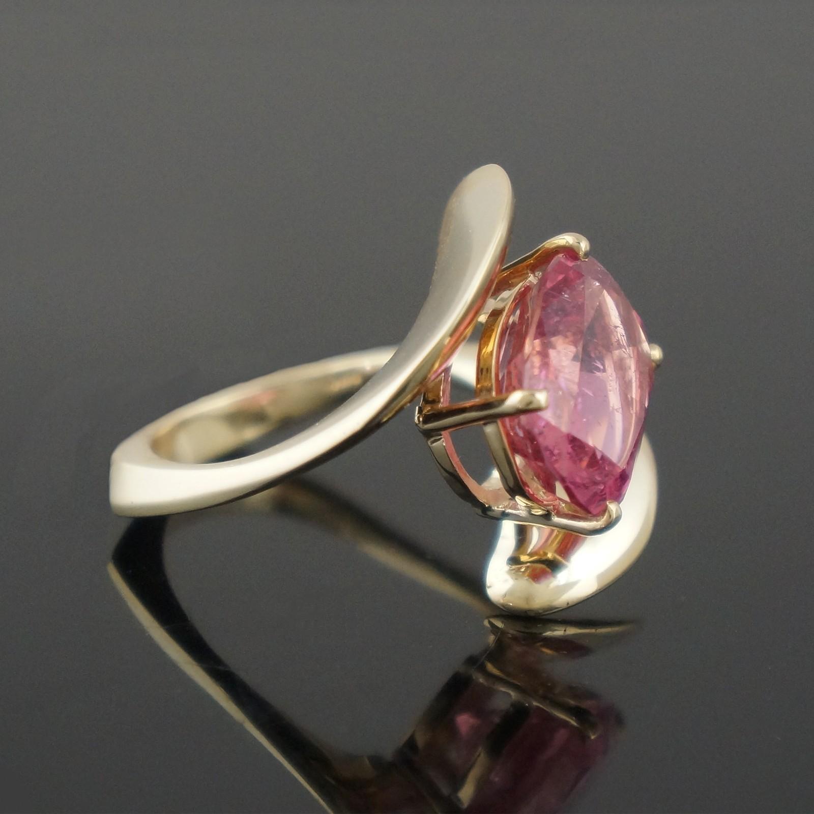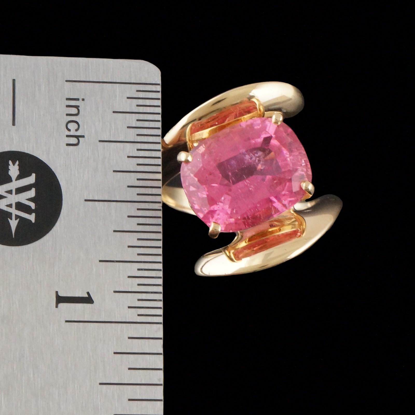 Modernist solid 14K Yellow gold, and natural pink tourmaline bypass cocktail ring in excellent original condition. Please see our high resolution photos, with magnifying option, for your review.
