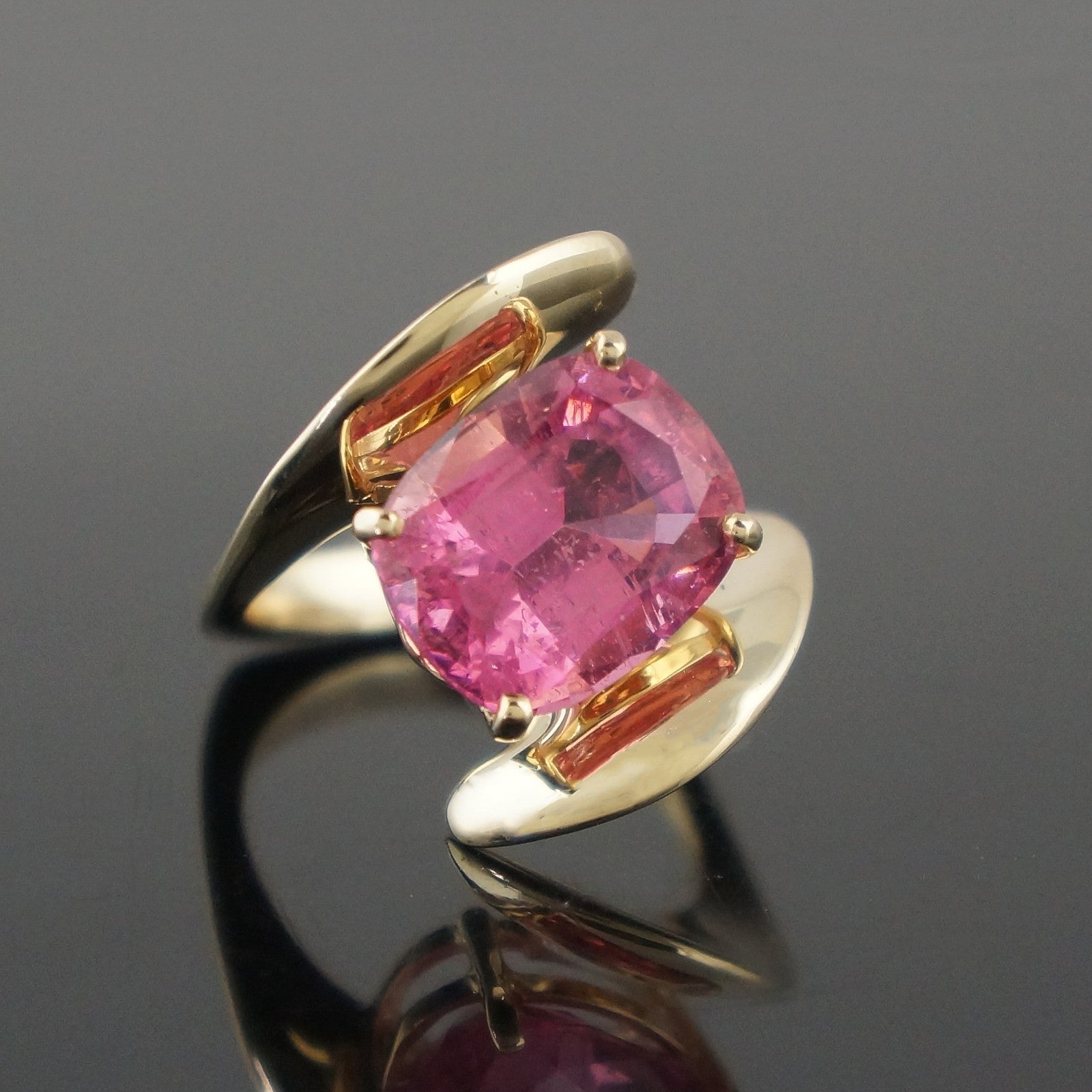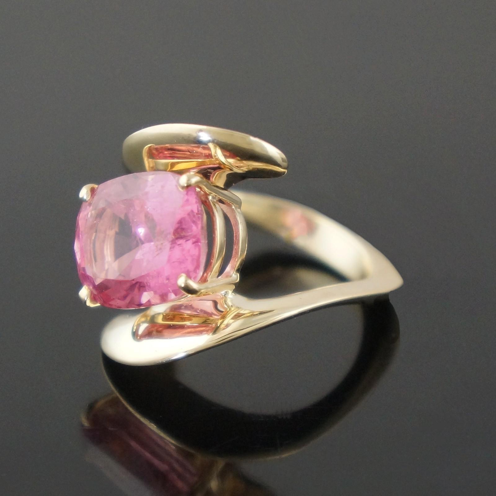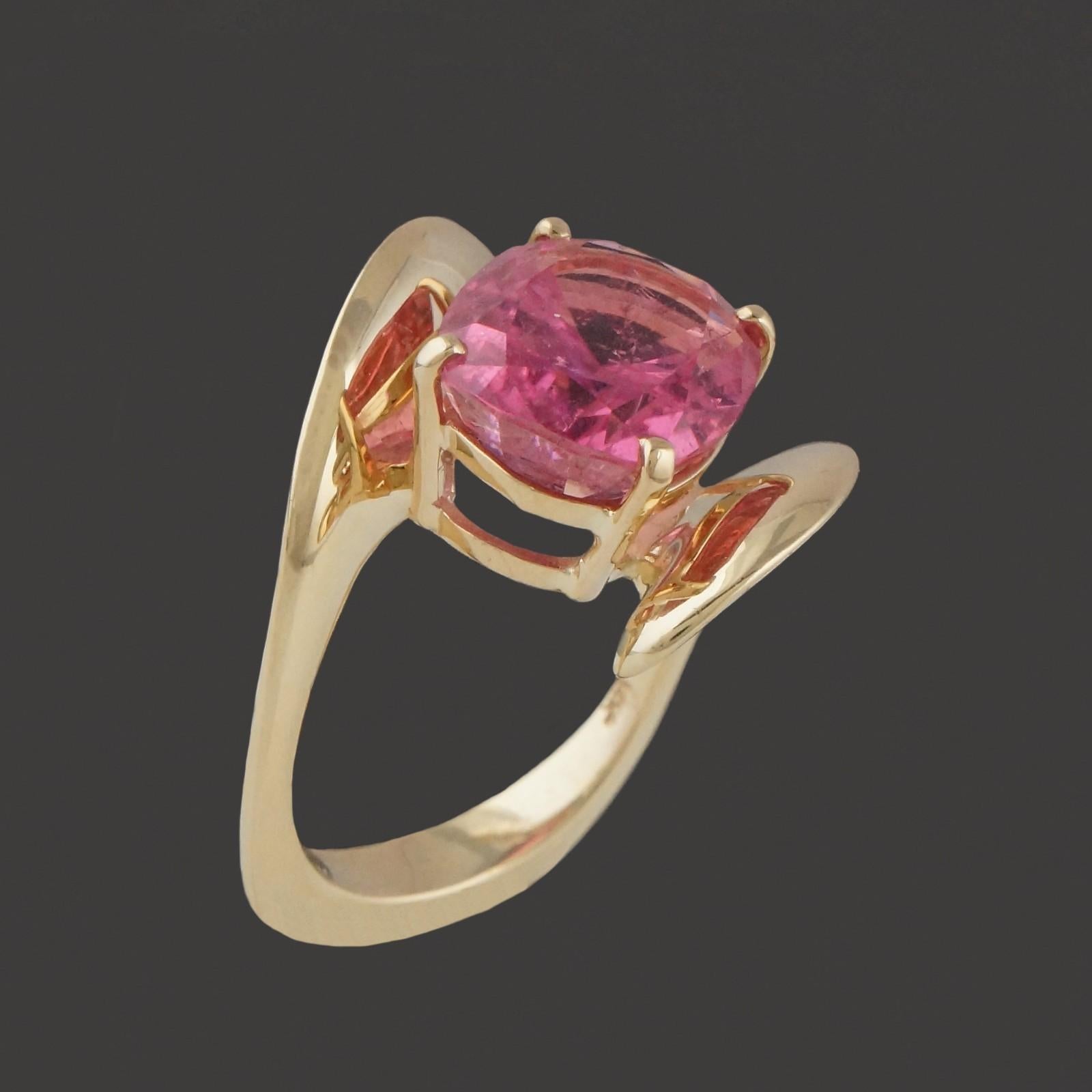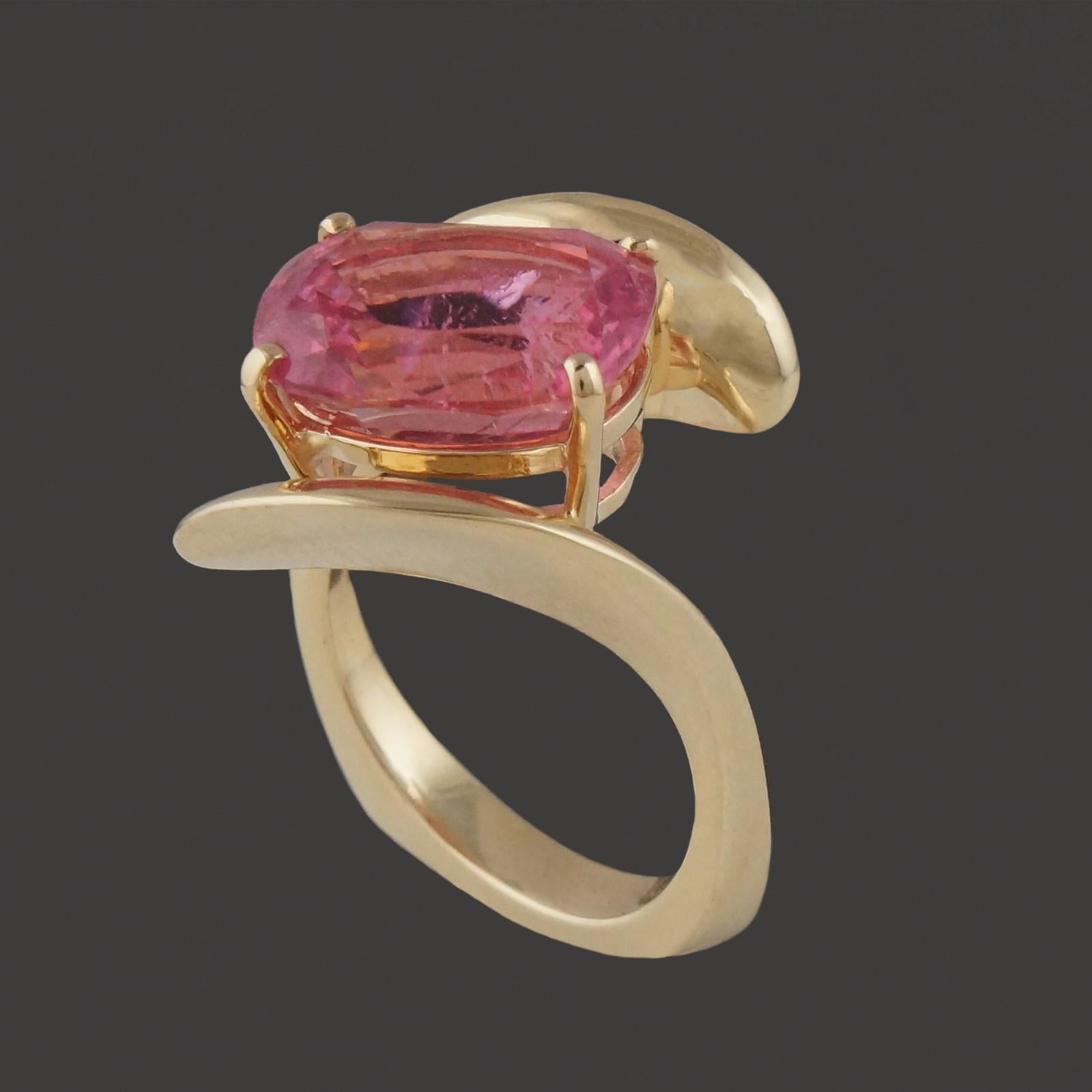 Modernist solid 14K Yellow gold, and natural pink tourmaline bypass cocktail ring in excellent original condition. Please see our high resolution photos, with magnifying option, for your review.