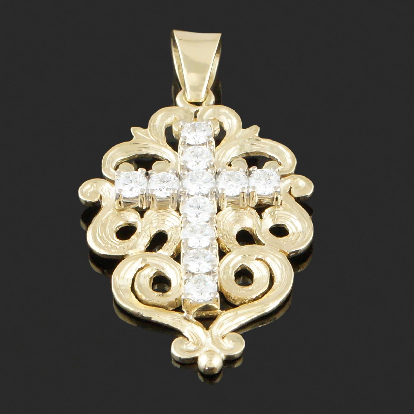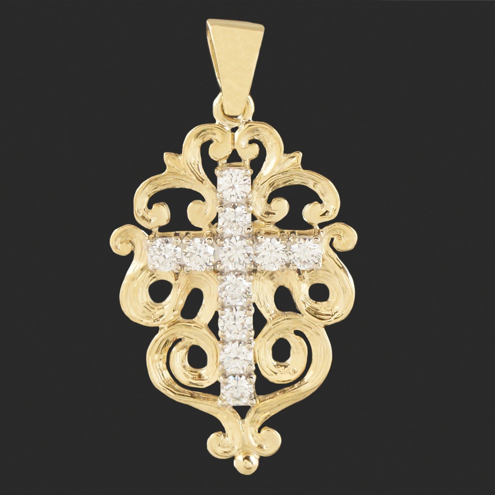 Two tone solid 18K yellow gold filigree and white gold set diamond holy cross pendant in excellent original condition.  High quality and beautifully crafted estate piece. Please see our high resolution photos, with magnifying option, for your review.