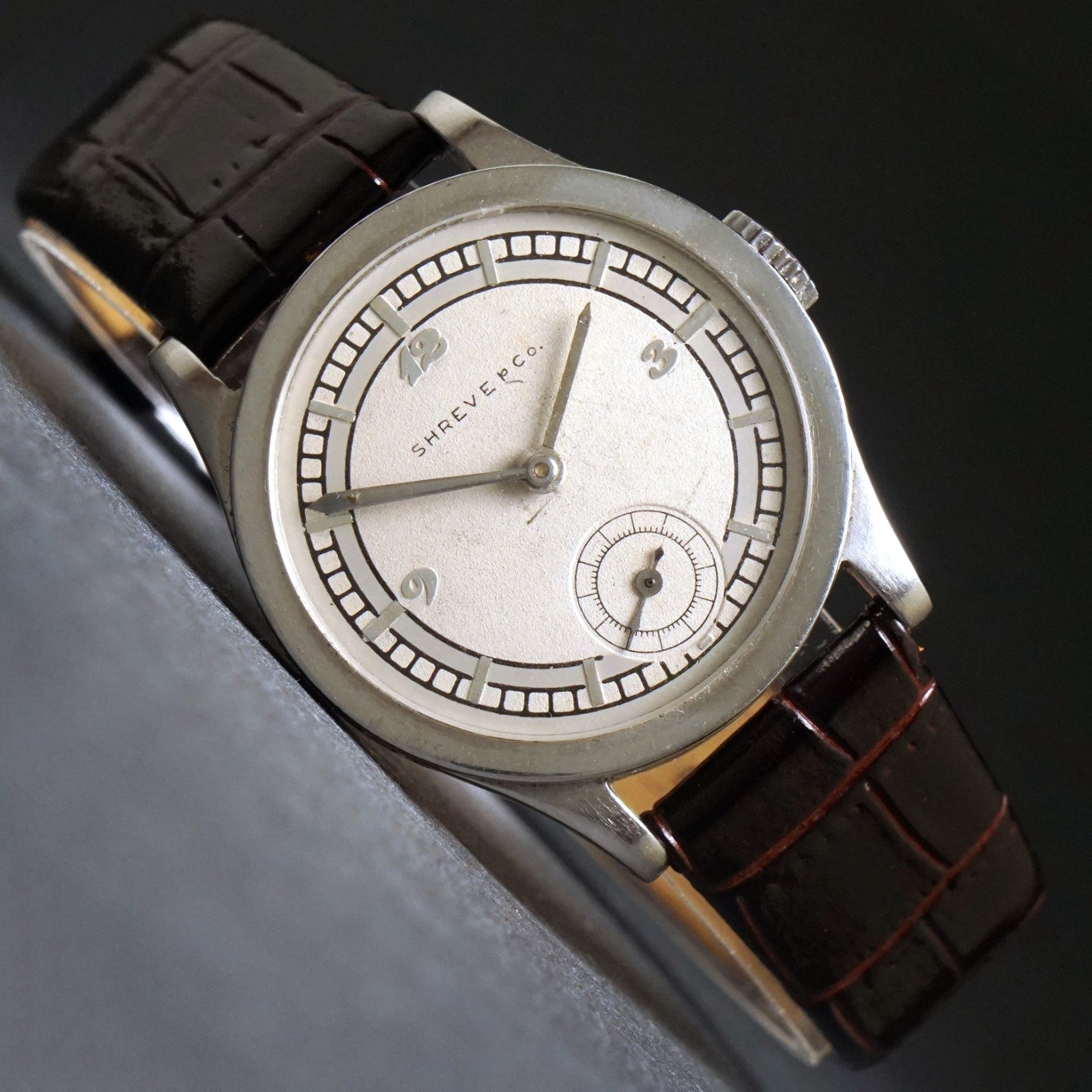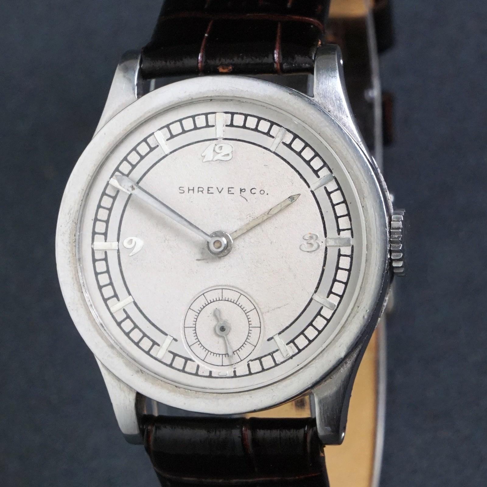 Stunning and rare 1935 Omega for Shreve & Co Kalonium mid-size watch in excellent condition. What a rare and interesting piece. Made just before WWII and retailed by Shreve & Co., San Francisco's premier jeweler and purchased out of a prominent San Francisco estate. The Kalonium case shows minor normal signs of use, excellent condition overall. Excellent crystal and original unsigned crown. Excellent dial with some age and nicks. Inside, the hand winding movement is currently running strong and keeping time although service history unknown. Fitted to a brand new high quality leather strap with steel buckle. Case measures 30mm wide with 16mm lugs. Authenticity unconditionally guaranteed.