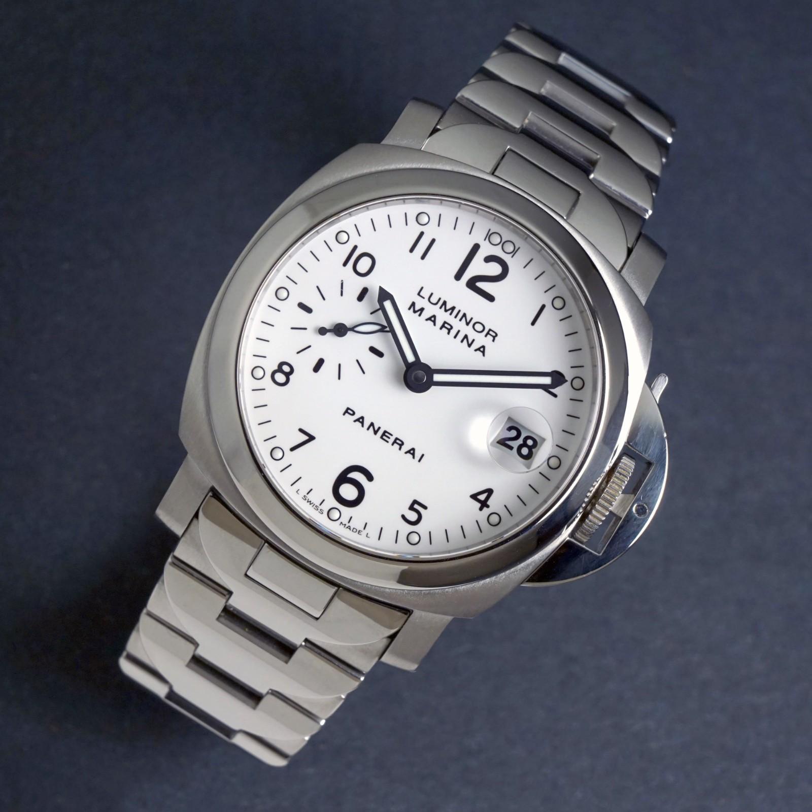 Stunning Panerai PAM00051 Luminor Marina stainless steel 40mm watch in excellent condition. Excellent example with original steel bracelet, box, and book. The stainless steel case and bracelet show little to no signs of use, excellent condition overall. Excellent crystal and crown. Excellent original white dial, hands and markers. Inside, the automatic movement is currently running strong and keeping excellent time although service history unknown. Fitted to its original stainless steel bracelet with signed clasp as shown. Case measures 40mm wide with 22mm lugs. Will fit up to a size 8" wrist. Comes with its original boxes and book as shown. Authenticity unconditionally guaranteed.