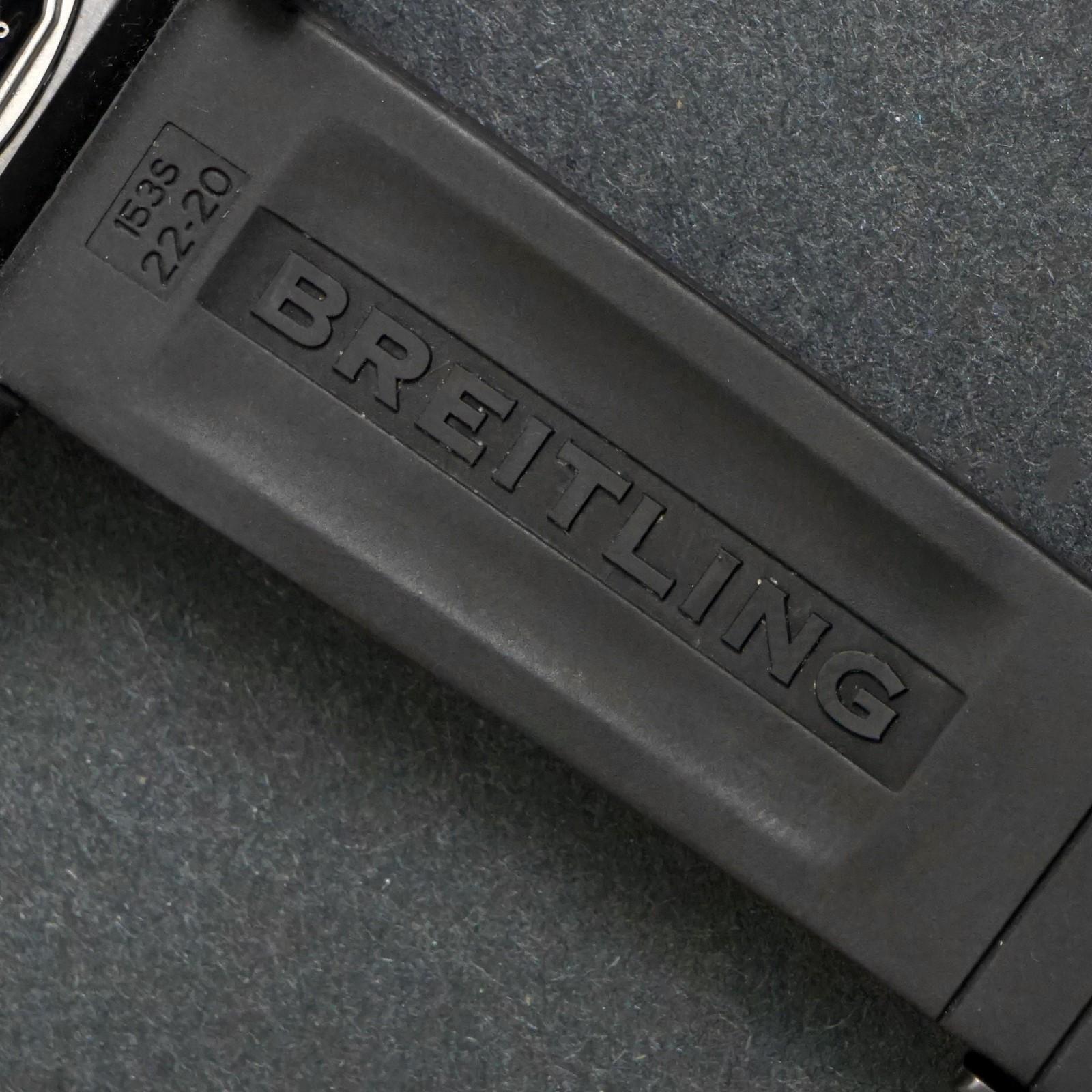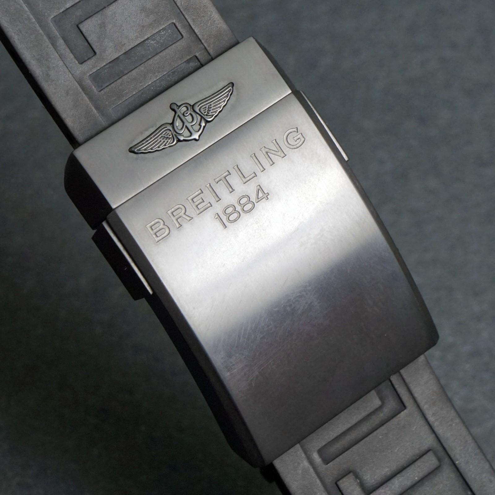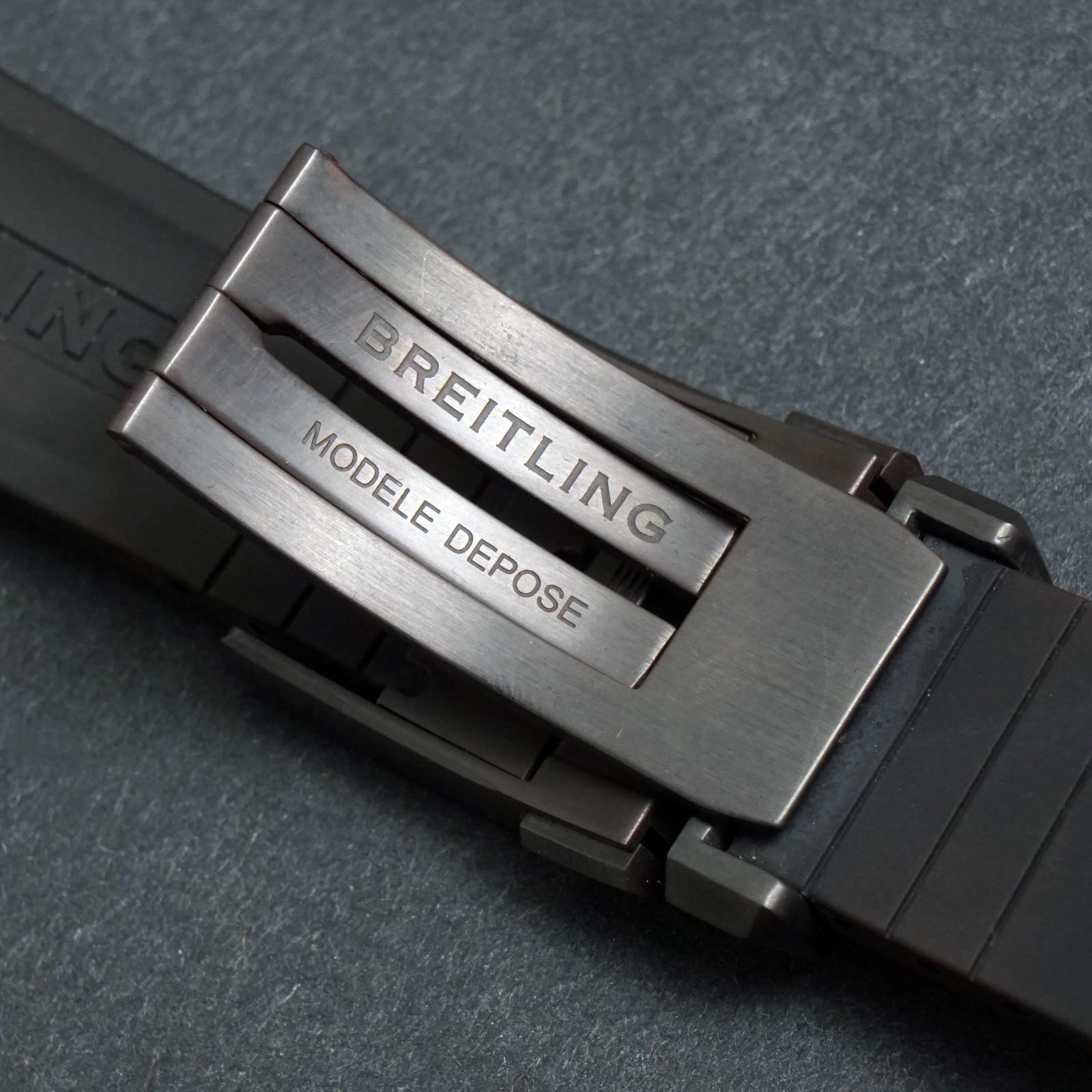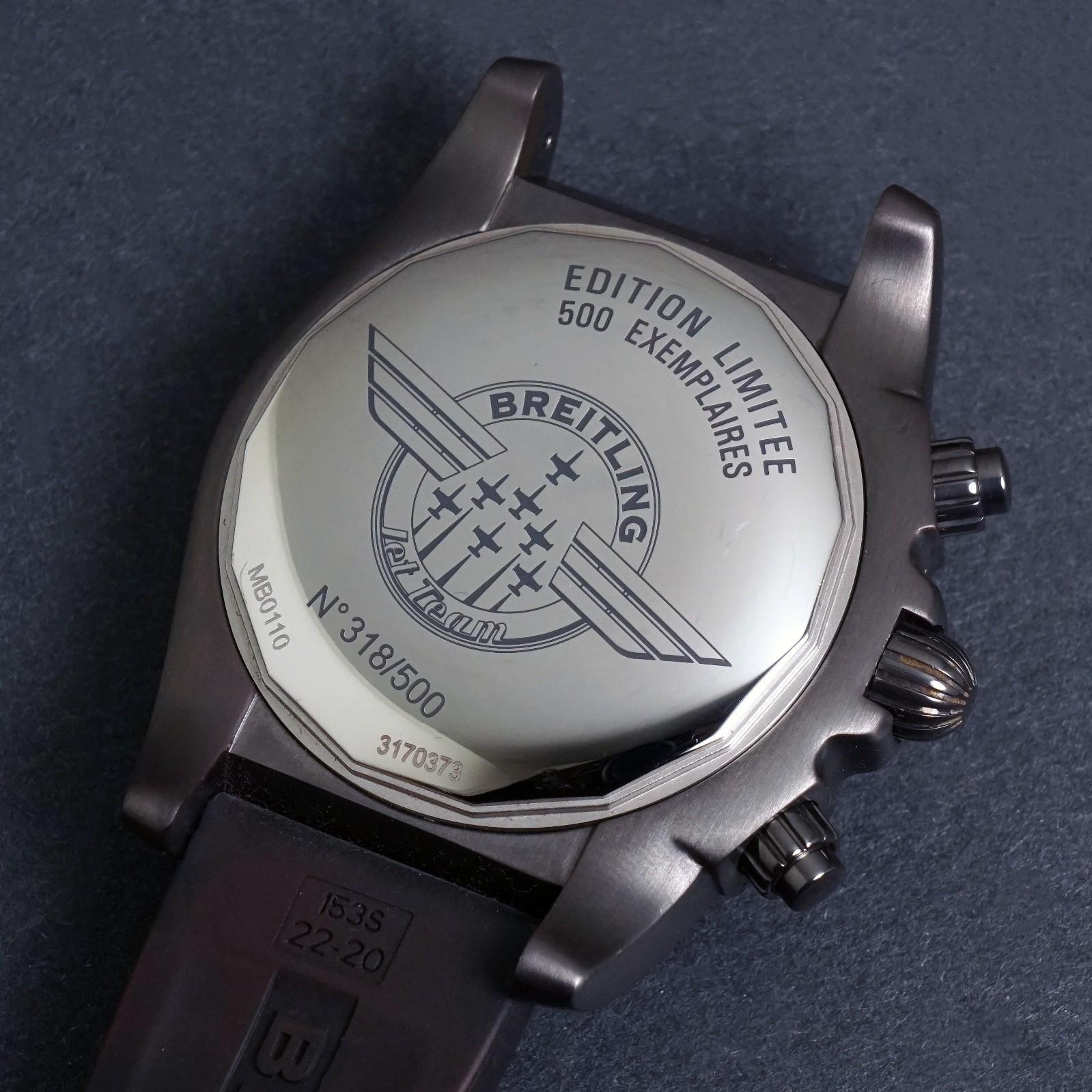 Stunning Breitling Chronomat Jet Team black stainless steel Limited Edition watch in excellent condition. The black steel case shows almost no signs of use, excellent condition overall. Original crystal and crown. Excellent original dial, hands and markers. Inside, the automatic movement is currently running strong and keeping excellent time although service history unknown. All Chronograph functions work properly. Fitted to its original black rubber strap with signed steel clasp as shown. Will fit a 7 3/4" wrist. Case measures 44mm wide with 22mm lugs. Authenticity unconditionally guaranteed.