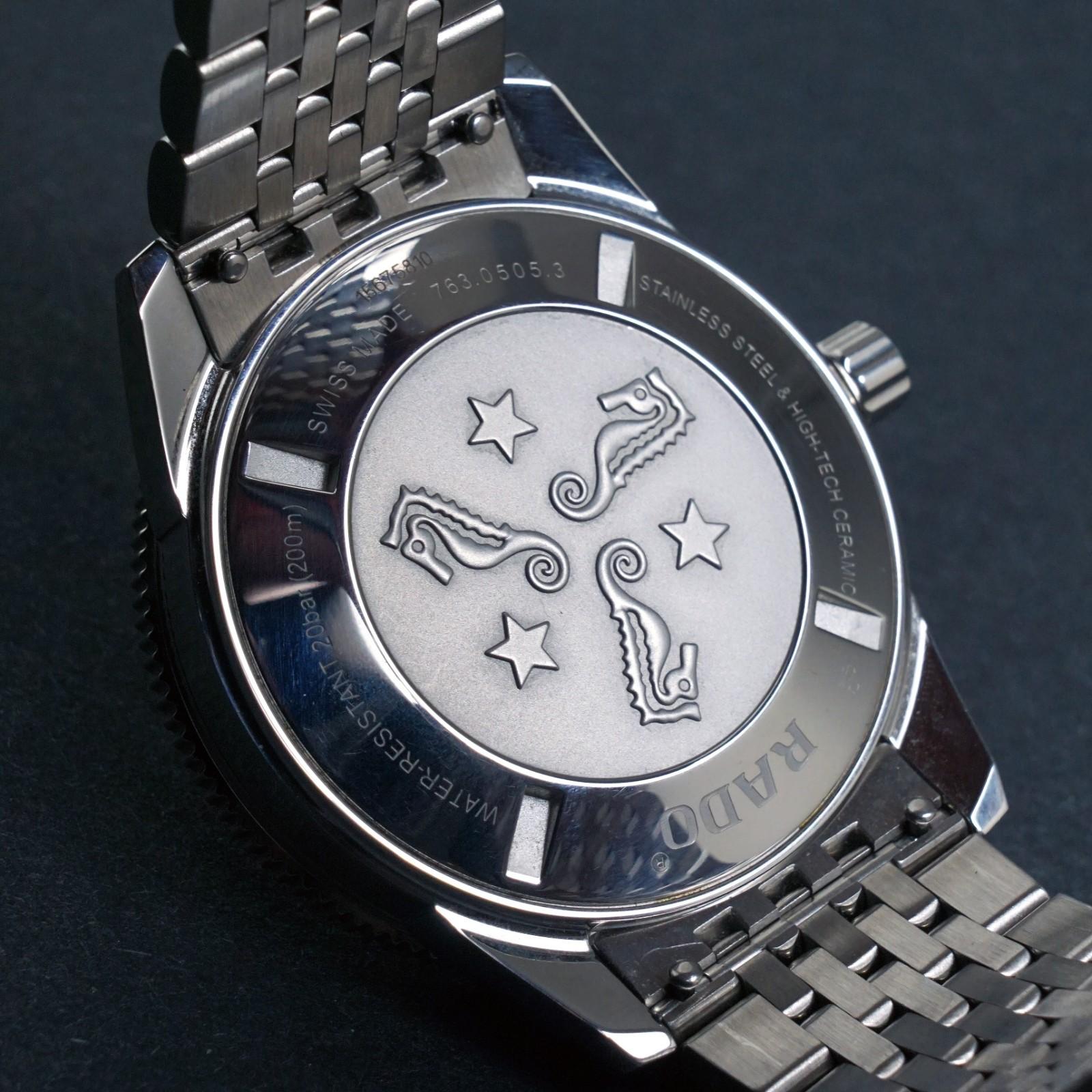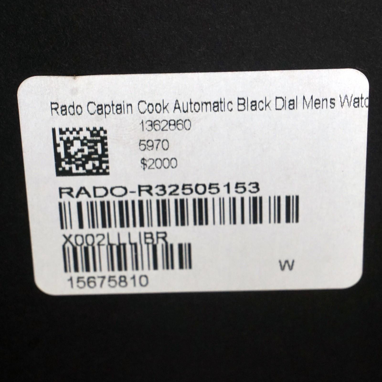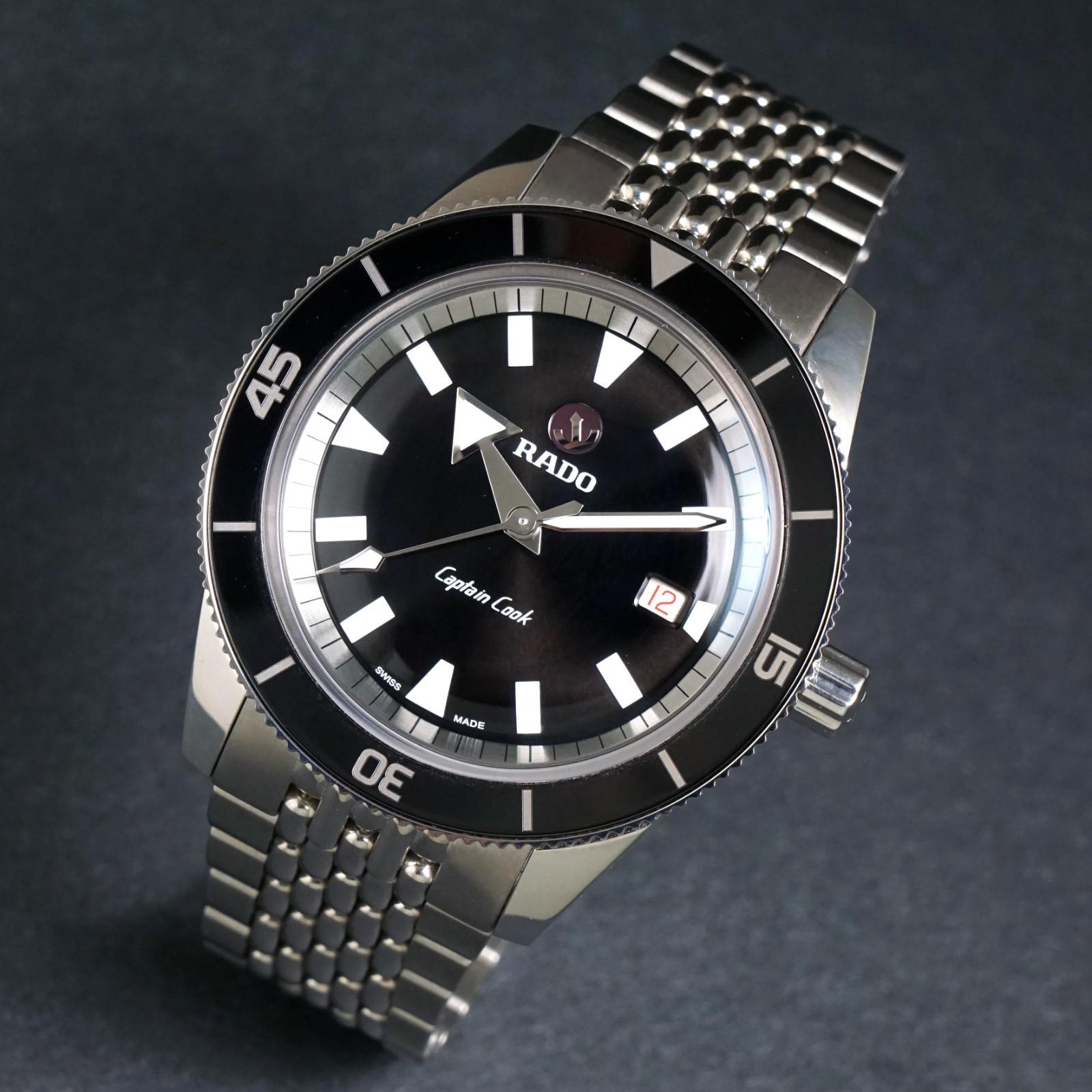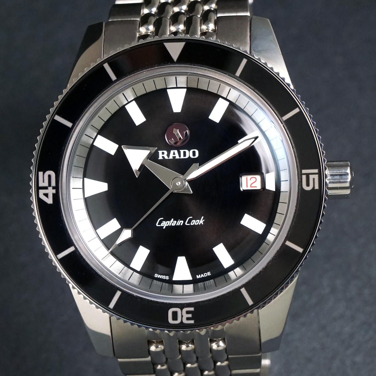 Stunning Rado Captain Cook stainless steel automatic man's watch in excellent condition. One owner watch appearing to have never or hardly been used and complete with inner and outer boxes, cards, book, cloth and tag.  Excellent steel case and bracelet. Original crystal and signed crown. Excellent original dial, hands and markers. Inside, the automatic movement is currently running strong and keeping excellent time although service history unknown. Fitted to its original stainless steel bracelet with signed clasp as shown. Case measures 42mm wide with 21mm lugs. Will fit up to a size 7 1/2" wrist. Comes with its original boxes, book, cards, cloth and tag as shown. Authenticity unconditionally guaranteed.