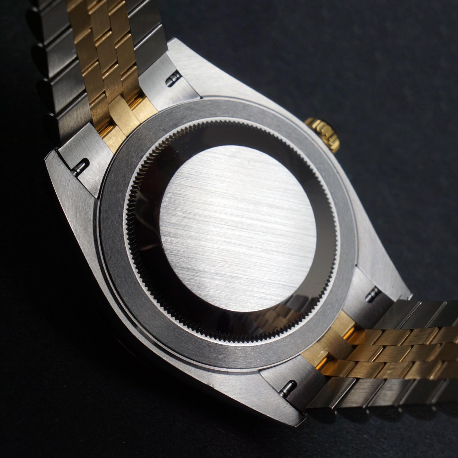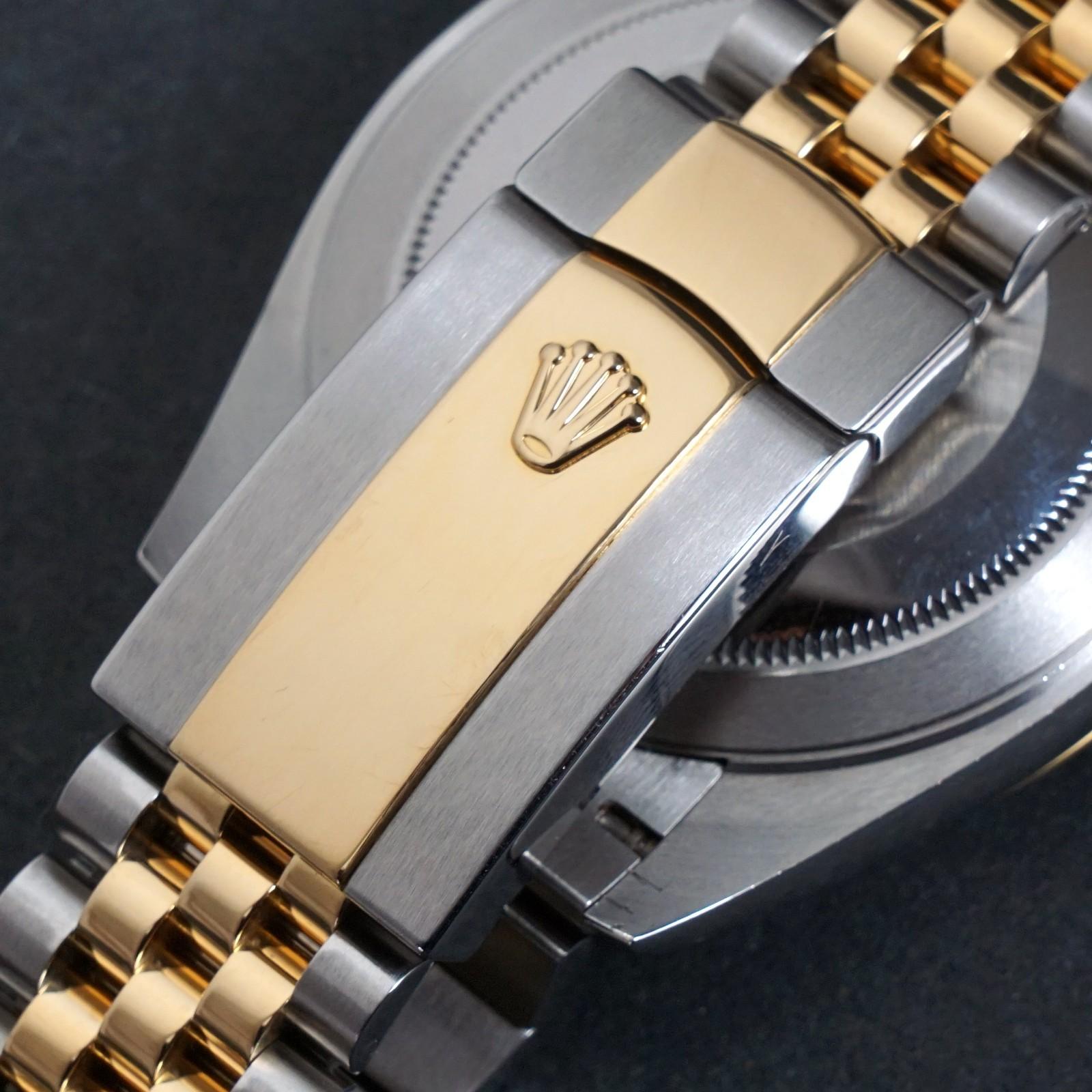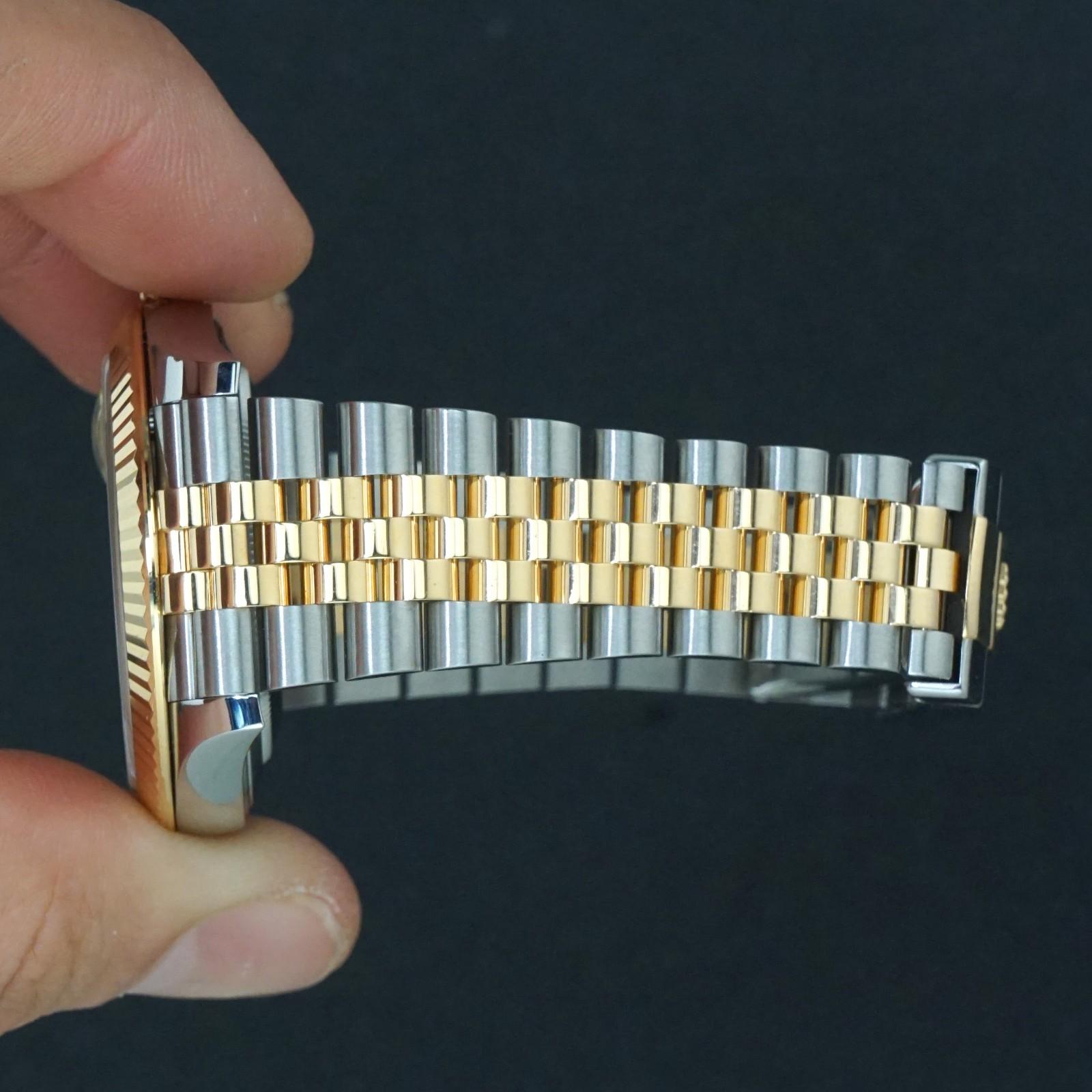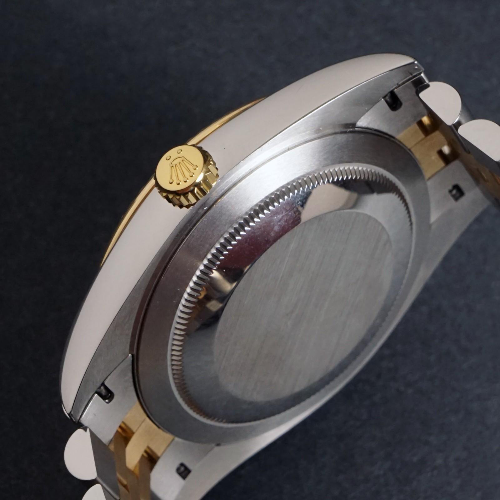 Stunning Rolex Datejust 41 two tone 18K gold and steel man's watch in excellent, virtually MINT condition. Fluted bezel and Jubilee bracelet. Stainless steel case with yellow gold fluted bezel and yellow gold signed crown. Excellent original sapphire crystal. Excellent original dial, hands and markers. Inside, the automatic movement is currently running strong and keeping excellent time although service history unknown. Fitted to its original 18K gold and steel Jubilee two tone bracelet with bracelet with signed clasp as shown. Case measures 41mm wide with 20mm lugs. Will fit up to a size 7 3/4" wrist. Comes with its original box as shown. Authenticity unconditionally guaranteed.