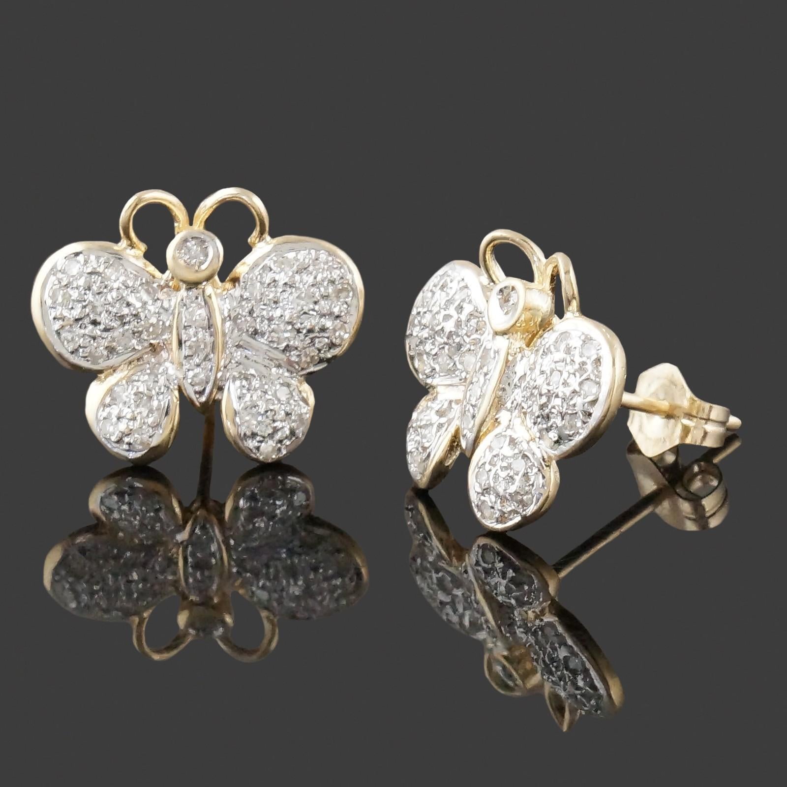 Vintage Two Tone Solid 14K Gold & Diamond Butterfly Motif Stud Earrings
