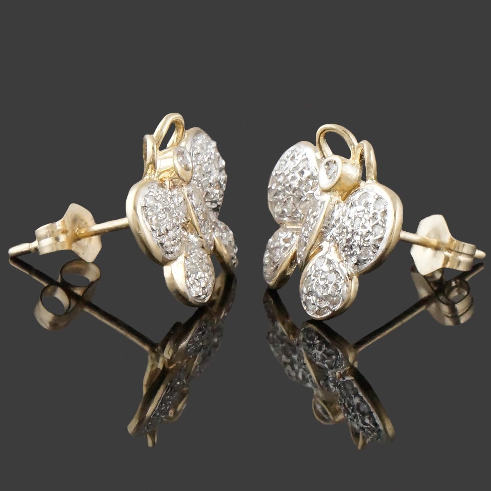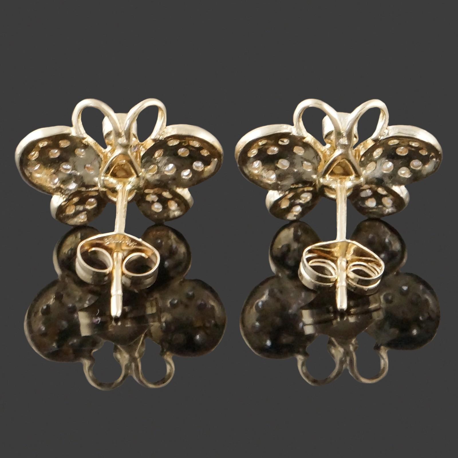 Two-tone solid 14K gold and diamond set butterfly motif stud earrings in excellent original condition. High quality, well made estate pair. Please see our high resolution photos, with magnifying option, for your review.