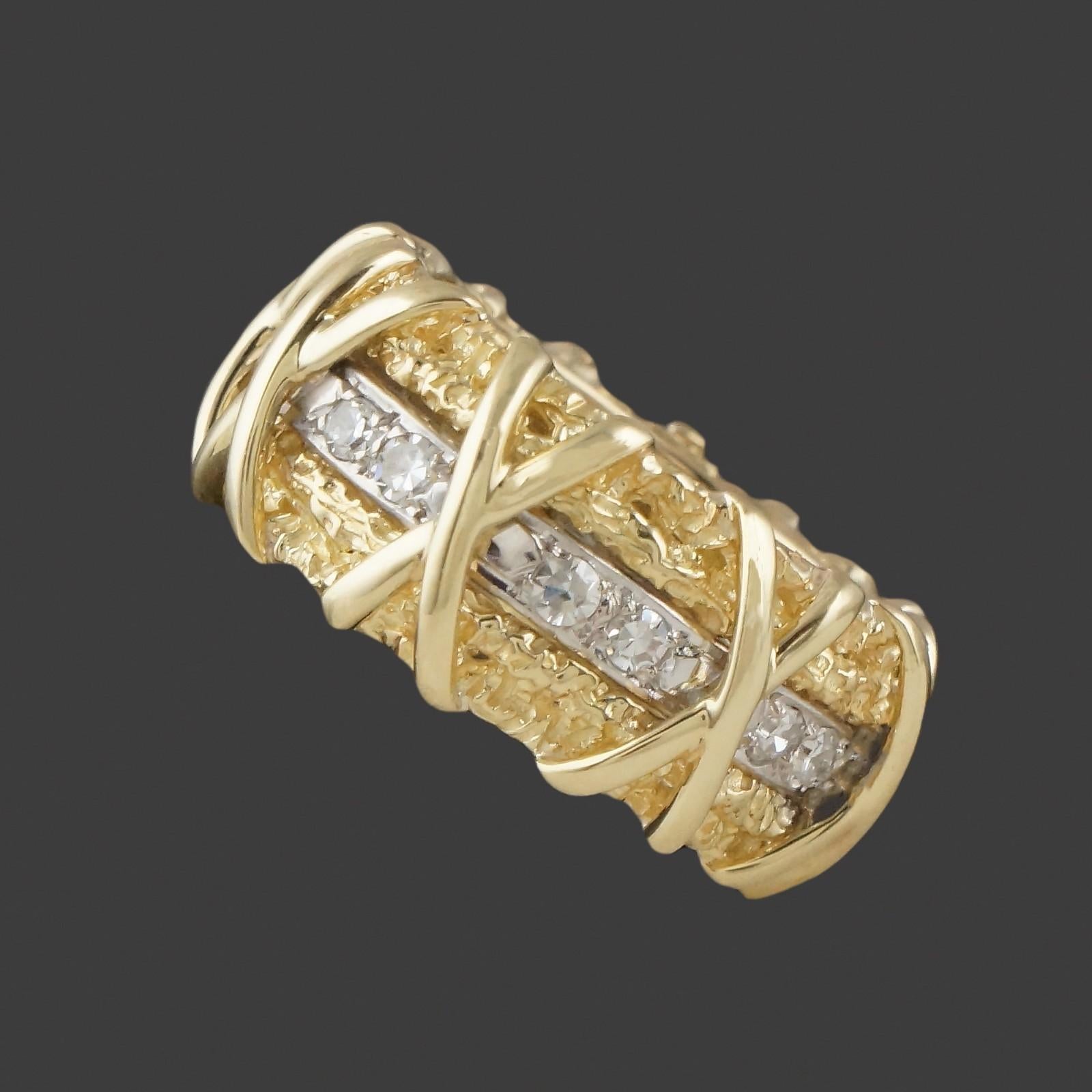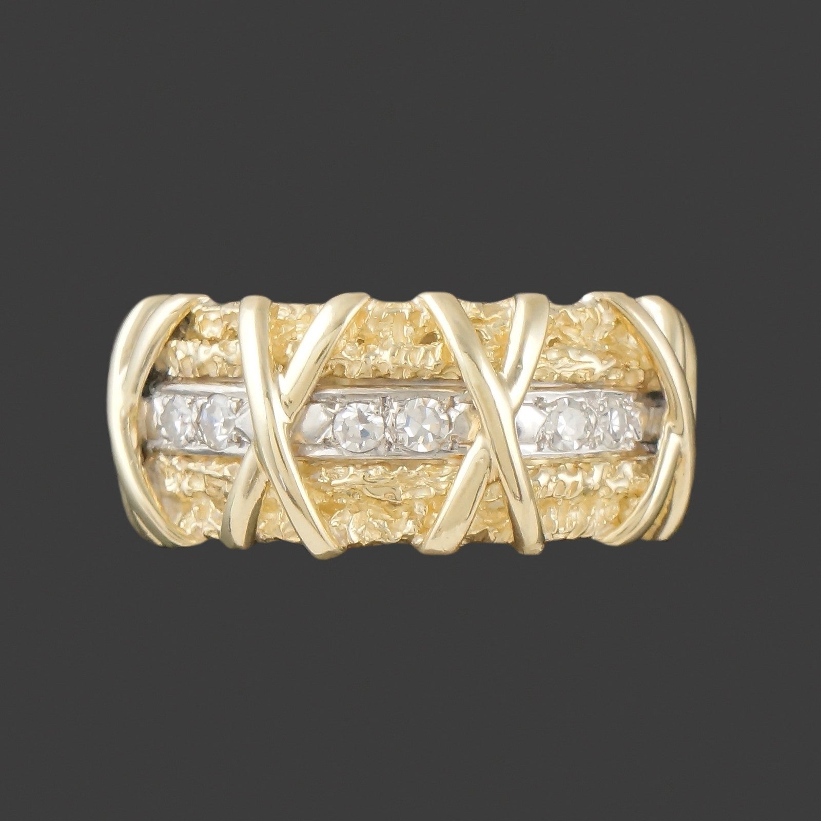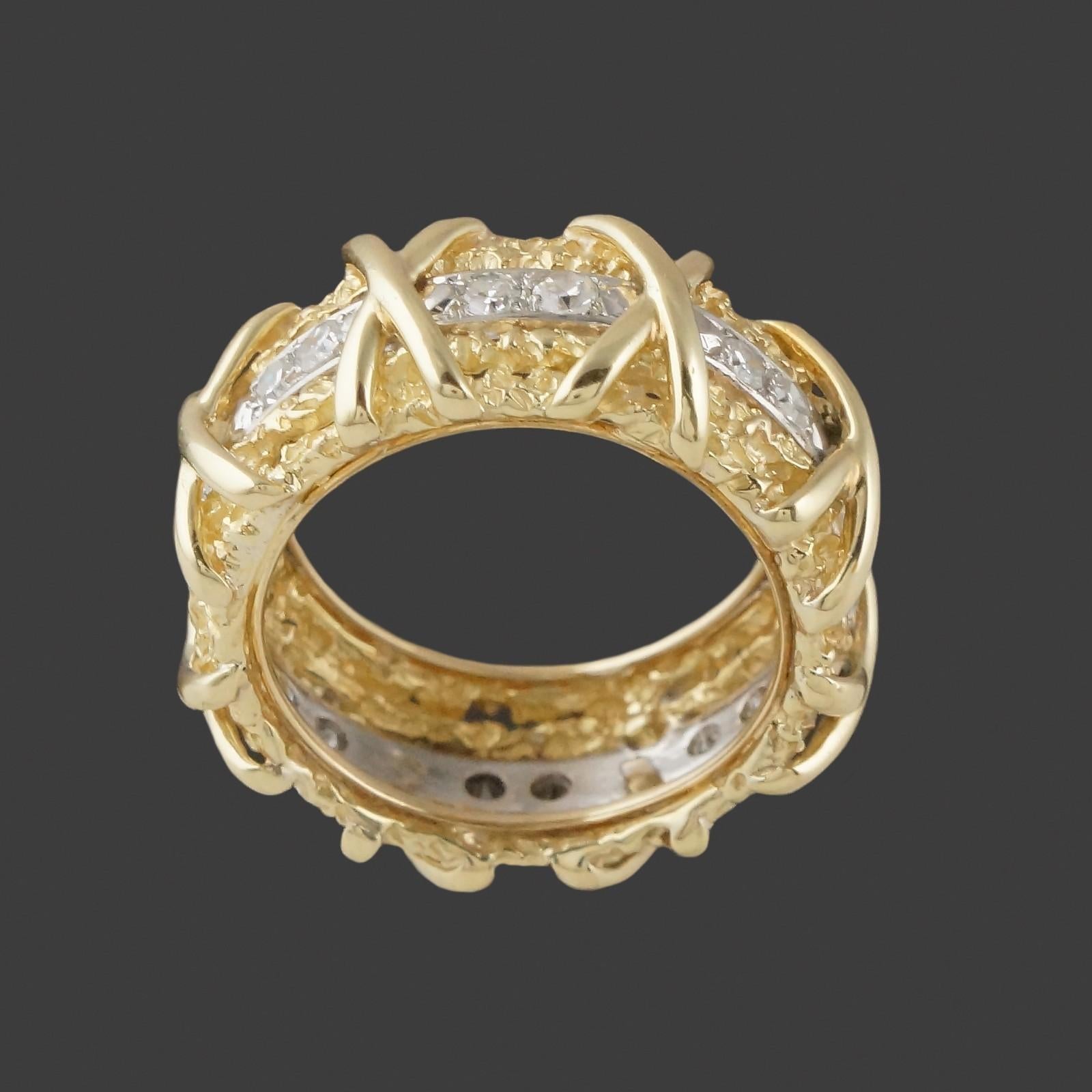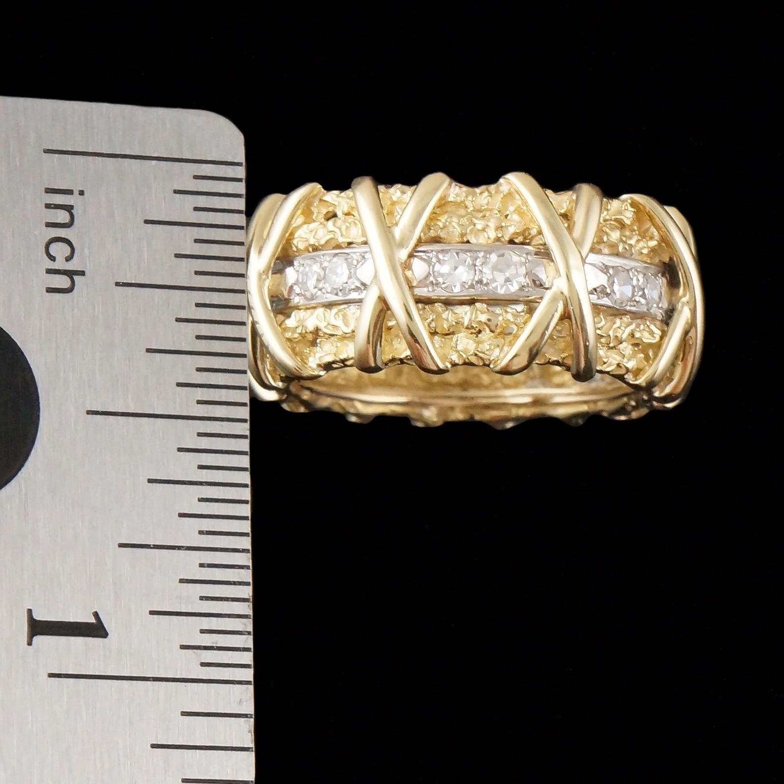 Wide solid 18K yellow gold nugget textured and diamond set X wedding anniversary band in excellent original condition. High quality, beautifully made estate piece. Few signs of use, excellent overall. Please see our high resolution photos of this estate piece, with magnifying option, for your review.