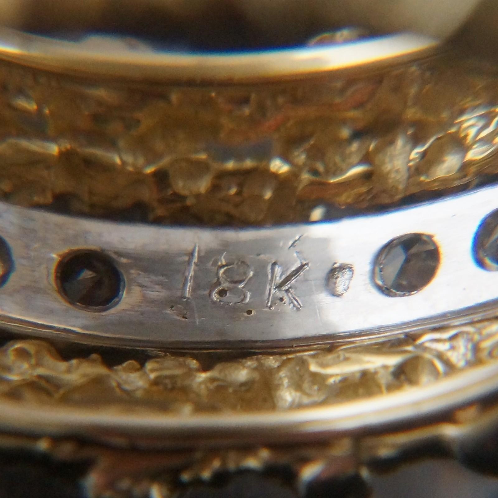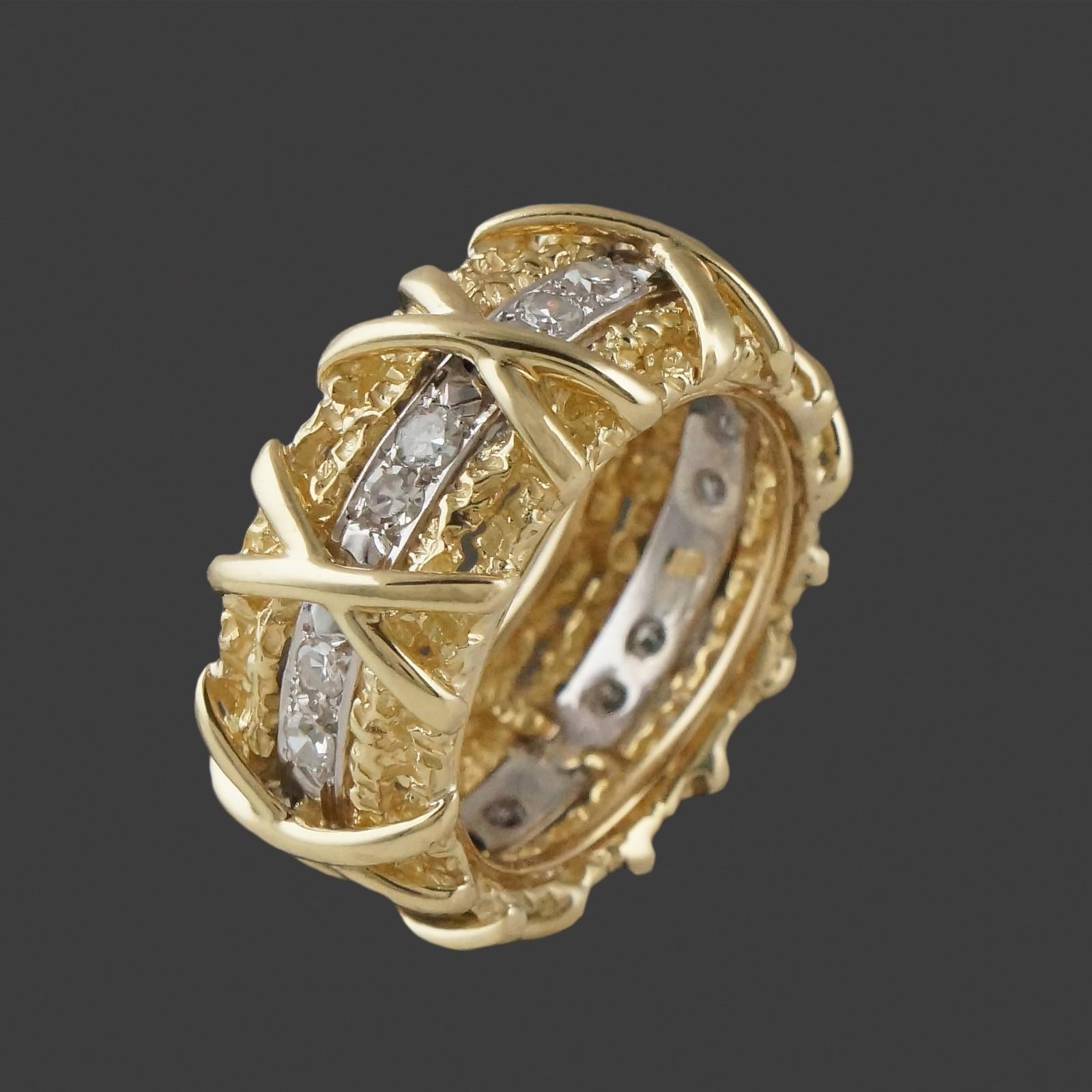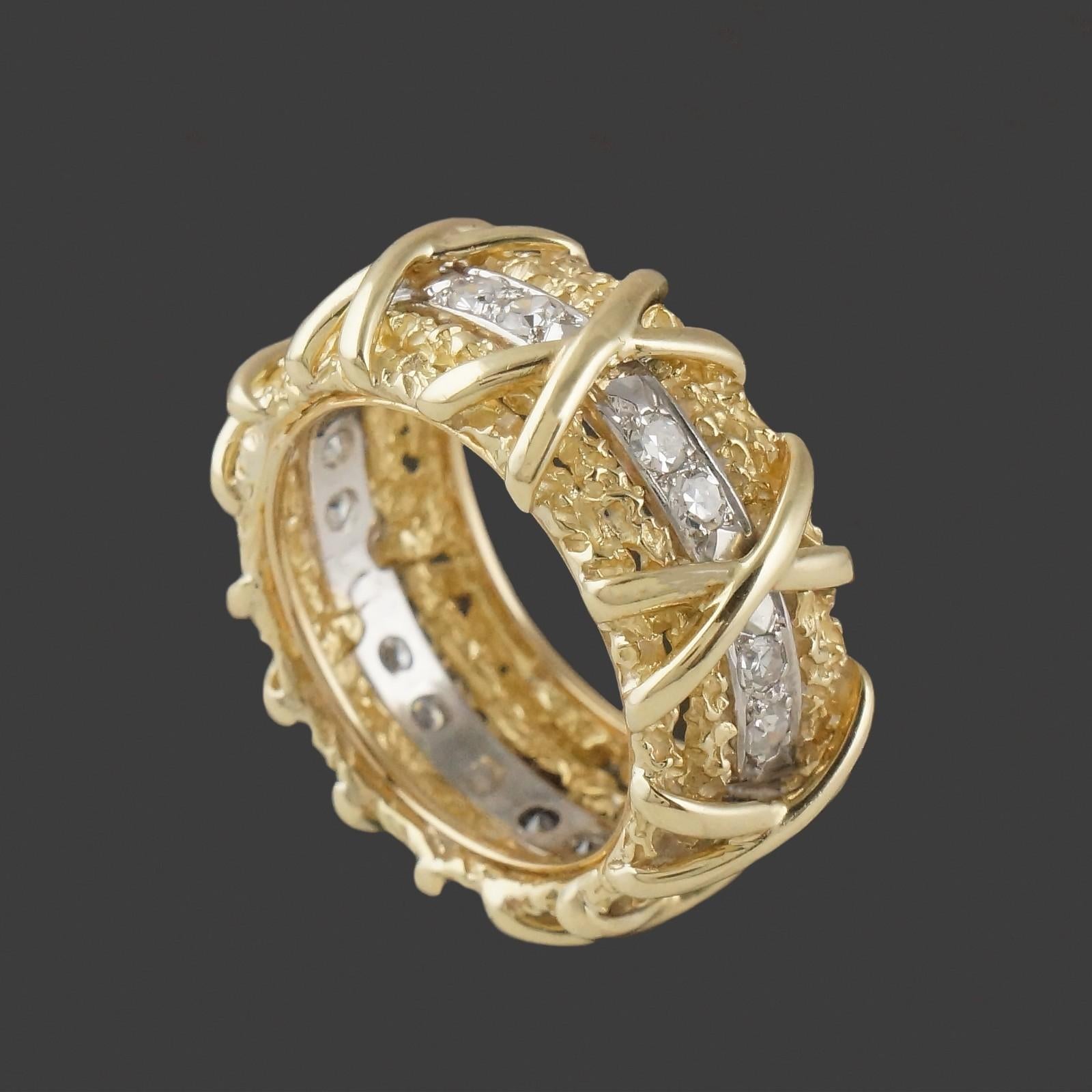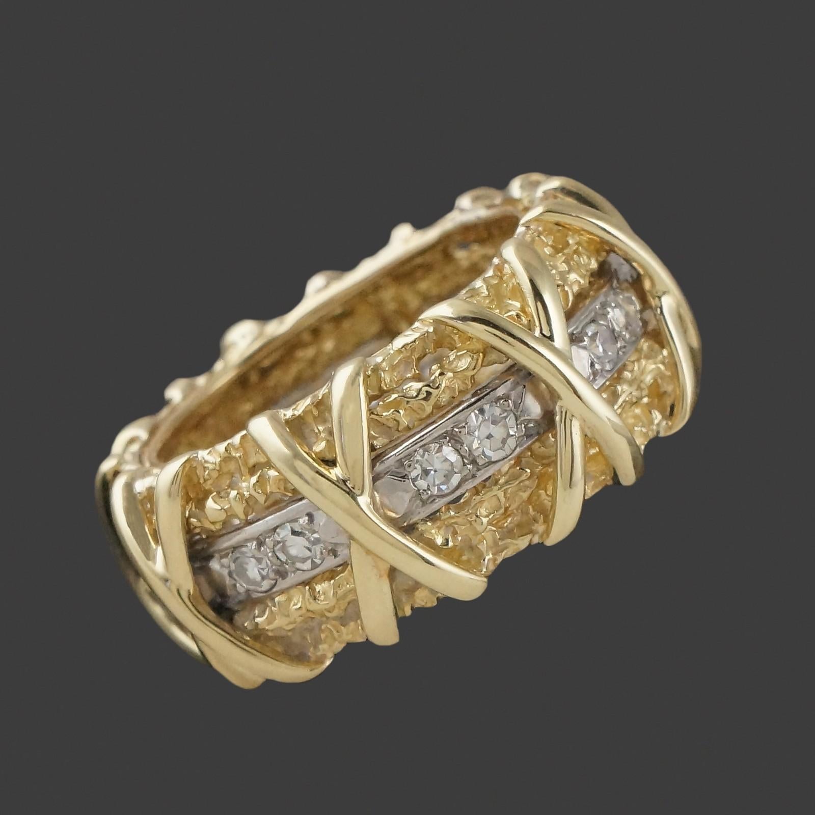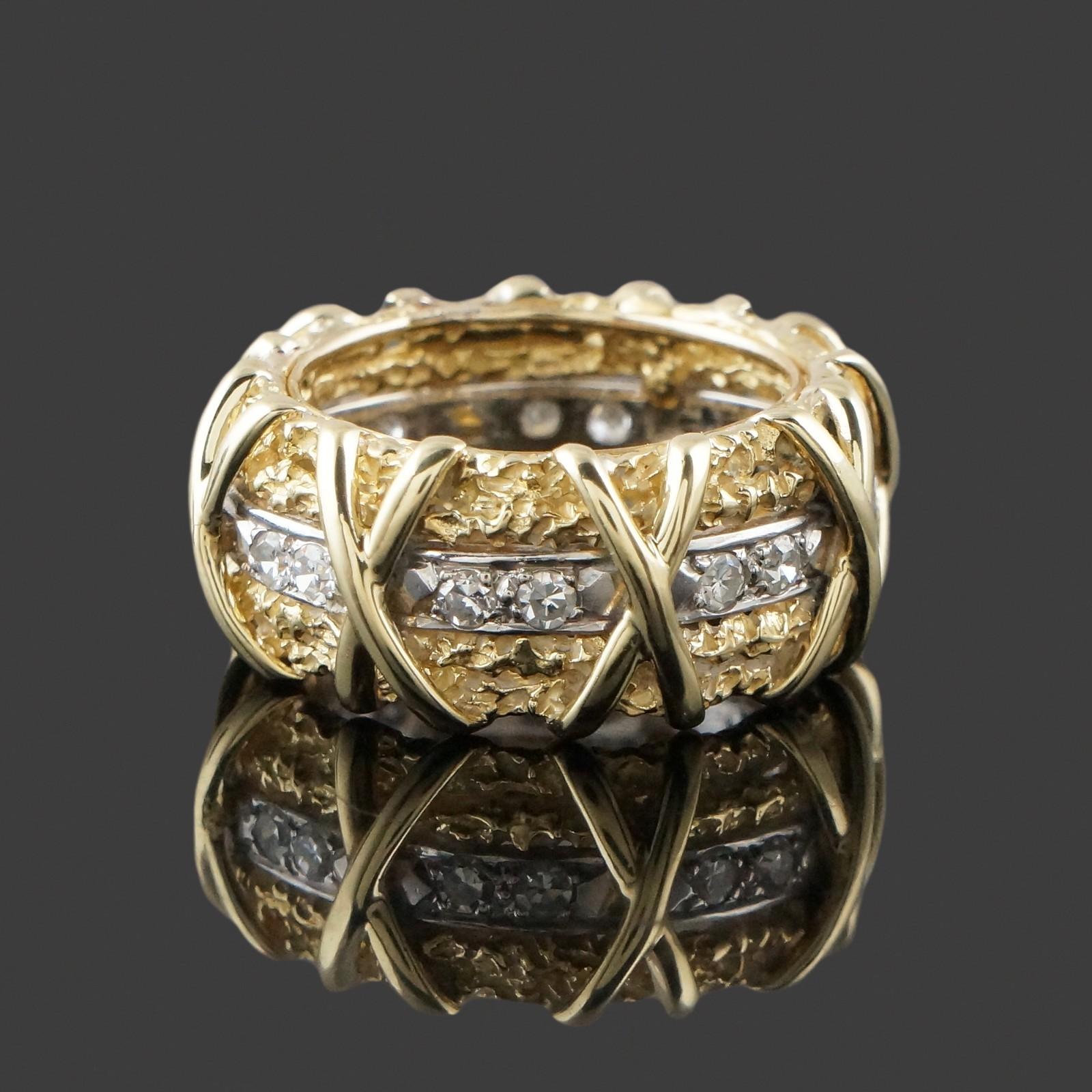 Wide solid 18K yellow gold nugget textured and diamond set X wedding anniversary band in excellent original condition. High quality, beautifully made estate piece. Few signs of use, excellent overall. Please see our high resolution photos of this estate piece, with magnifying option, for your review.